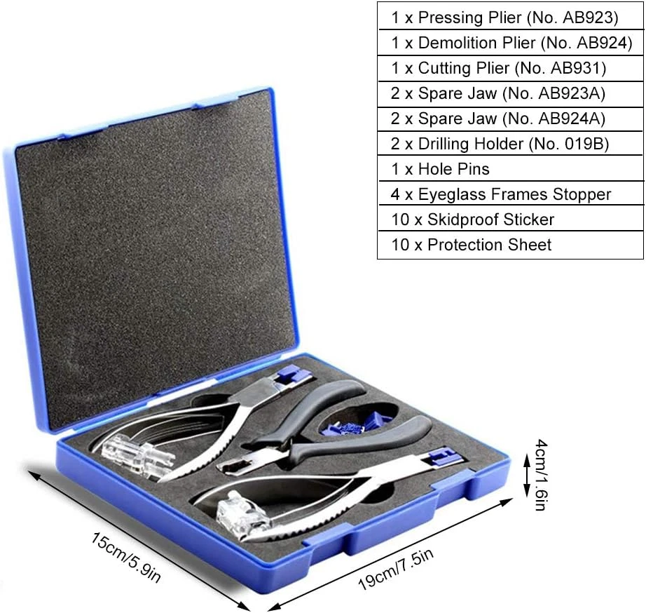 Store New Arrivals Add to Favorite View Feedback Contact Rimless Glasses Frame Silhouettes Eyeglass Optical Kit, Glasses Frame Plier Eyeglass Plier Professional Eyeglasses Plier Set Rimless Disassembly Glasses Frames Optical Tools Kit Description Item model number Cimenn-GZP-66121155 Part Number Cimenn-GZP-66121155 Batteries Required? No Color Stainless Steel,blue Material Stainless Steel Country of Origin China Grip Type Ergonomic Specific Uses For Product Professional Item Weight 570 Grams Handle Material Stainless,Plastic,Metal,Steel Batteries Included? No Package Dimensions 7.48 x 5.91 x 1.57 inches lasting AND PRACTICAL: Made of high quality stainless steel material, and the tip of plier equiped with plastic cover, so that the lens of glasses will not be scrab, help you avoid unnecessary losses, please rest assured that use our products HAND TOOLS: there are three different type of pliers in our glasses plier Kit, the cutting pliers(only for plastic plug not metal), demolition tongs, and installation pliers can help you repair rimless glasses quickly and perfectly APPLY: Professional eyeglasses pliers for glasses repair, comes with different types accessories, can help you save more time, if you are glasses repairer or people who often need glasses, this may be a good assitant for you EXQUISITE WORKMANSHIP: Outdoor stainless steel multi tool plier portable pocket mini camping Kit, the handle of these glasses repair pliers are designed with spring, it will automatically after use, Non-slip design on the edges, can provide more comfortable experience for you CONVENIENT TO CARRY: a eyeglasses repair tool set for you,packing with nice blue plastic case, it is light weight about 570 g/20.1 oz, you can take it on hand, or put into your bag and the car, very easy to carry Features: 1. Made of high grade material, which is lasting and practical. 2. Professional tools kit for rimless frame. 3. Quick and easy to repair glasses frames perfectly. 4. Packing with nice blue plastic case, convenient to carry. 5. A eyeglasses repair tool set for you. Specification: Condition: Brand New Type: Eyeglass Pliers Set Plier Material: Stainless Steel Color: As Pictures Show Package Weight: Approx. 550g Package Included: 1 x Pressing Plier (No. AB923) 1 x Pressing Plier (No. AB924) 1 x Cutting Plier (No. AB931) 2 x Spare Jaw (No. AB923A) 2 x Spare Jaw (No. AB924A) 2 x Drilling Holder (No. 019B) 1 x Hole Pins 4 x Eyeglass Frames Stopper 10 x Skidproof Sticker (anti-skid and avoid scratching) 10 x Sheet (prevent the drilling hole from being broken) ABOUT US We offer the best prices around on high quality products. Our E-store includes media such as books, movies, music and games while offering electronics, toys, sporting apparel, clothing, tools, general home, garden items and more. SHIPPING We are always working hard to ensure your package arrives as soon as possible. Please understand that some factors like weather, high postal traffic, and the performance of shipping companies are outside of our control. We offer free shipping to the lower 48 states and ship within 2 business days of payment, usually sooner. We do not accept P.O. Boxes. Please provide a physical address. For shipping outside of the continental USA, we only use eBay's Global Shipping Program.The item is shipped to KY and then sent to the rest of the world. International customers are responsible for all duties and taxes. Continue to check out in order to calculate costs for shipping the item to your country. Messages regarding eBay's Global Shipping Program MUST be directed at eBay EXCLUSIVELY. RETURNS We offer a 30-Day Return Policy on items which you are not completely satisfied with. You have the option for a full-refund or an exchange of the item. No returns are available on items shipped outside of the USA. PAYMENT We accept PayPal. CONTACT US This page content is yet to come Please ad us to your favorite seller and visit again later Thank You CUSTOMER SATISFACTION We try our very best to make sure every customer is completely satisfied. If there's a problem, message us! We're happy to help. WE ACCEPT Copyright © 2021 AutoDS. | All Rights Reserved