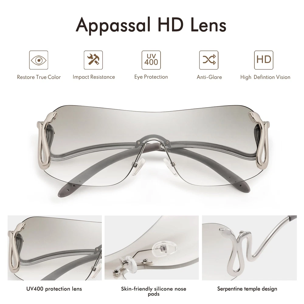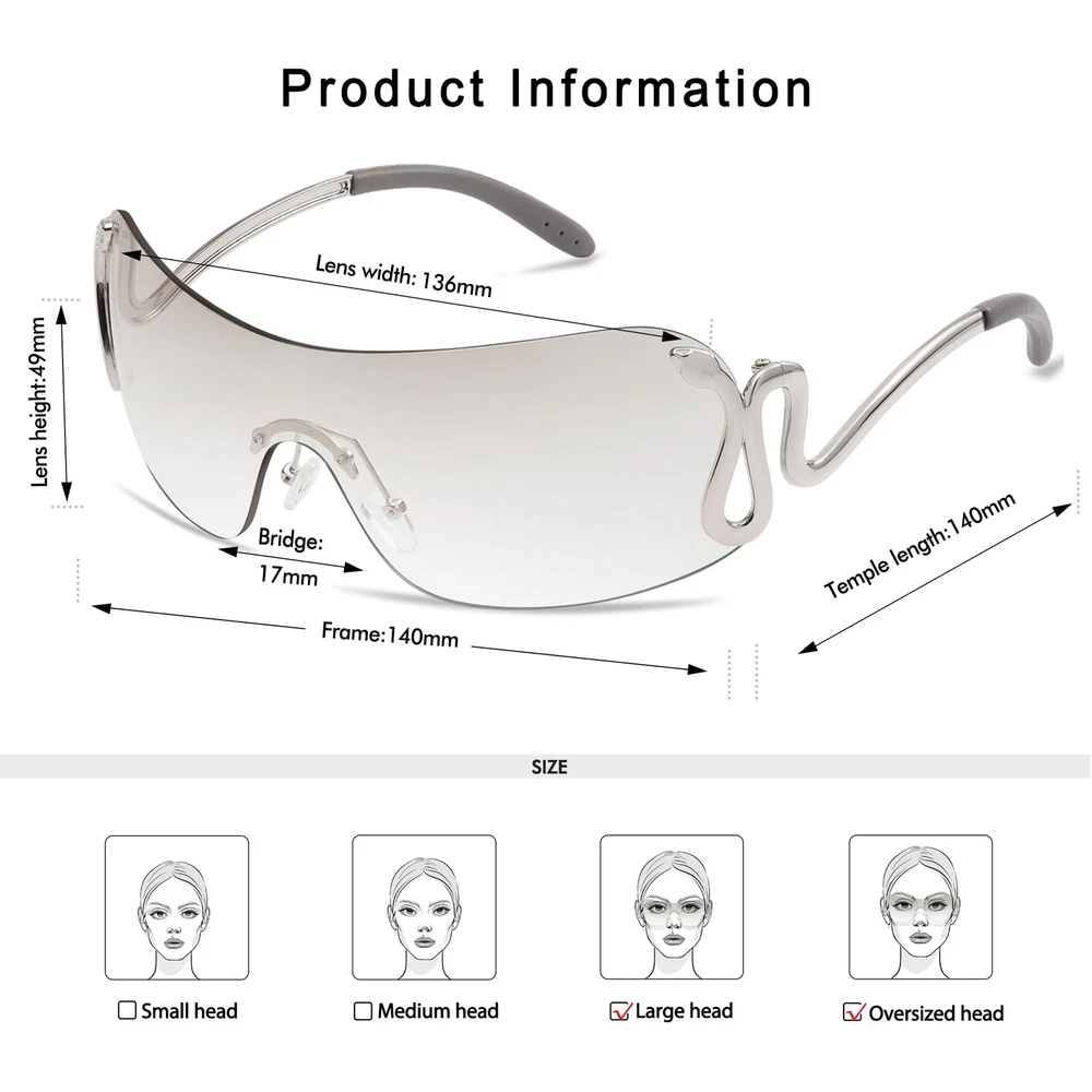 CLEAR SNAKE SUNGLASSES - Retro metal snake sunglasses for women arrives with a smooth curved front and bold temples. The silver shades for women perfectly fit the contours of the face, and the legs wrap around this metal snake accessory. No matter in daily life or at party, this trendy rimless sunglasses for women will be the highlight y2k accessories. UV400 PROTECTION LENSES - One of fashion’s hottest accessories, the sunglasses womens snake have wrap around shaped frames with one-piece lenses offering UV protection. Anti-glare lenses protect your eyes from long-term damage by blocking harmful UVA and UVB rays in any weather and condition. The combination of multiple lenses and frames provides you with more choices, which can match different daily outfits. HIGH-QUALITY MATERIALS - Made of lightweight metal frame, reinforced metal hinges and integrated nose pads, which makes our womens trendy sunglasses solid. The lens adopts multi-layer protective coating technology to achieve high saturation reflection effect. PRODUCT DIMENSION - Lens Width: 136mm; Lens Height: 49mm; Temple Length: 140mm; Nose Bridge: 17mm. GIFT PACKAGE SERVICE - Include 1* sunglasses, 1*microfiber cleaning cloth, 1*packaging case. Beautifully packaged sunglasses is also a perfect gift for your friends and family.