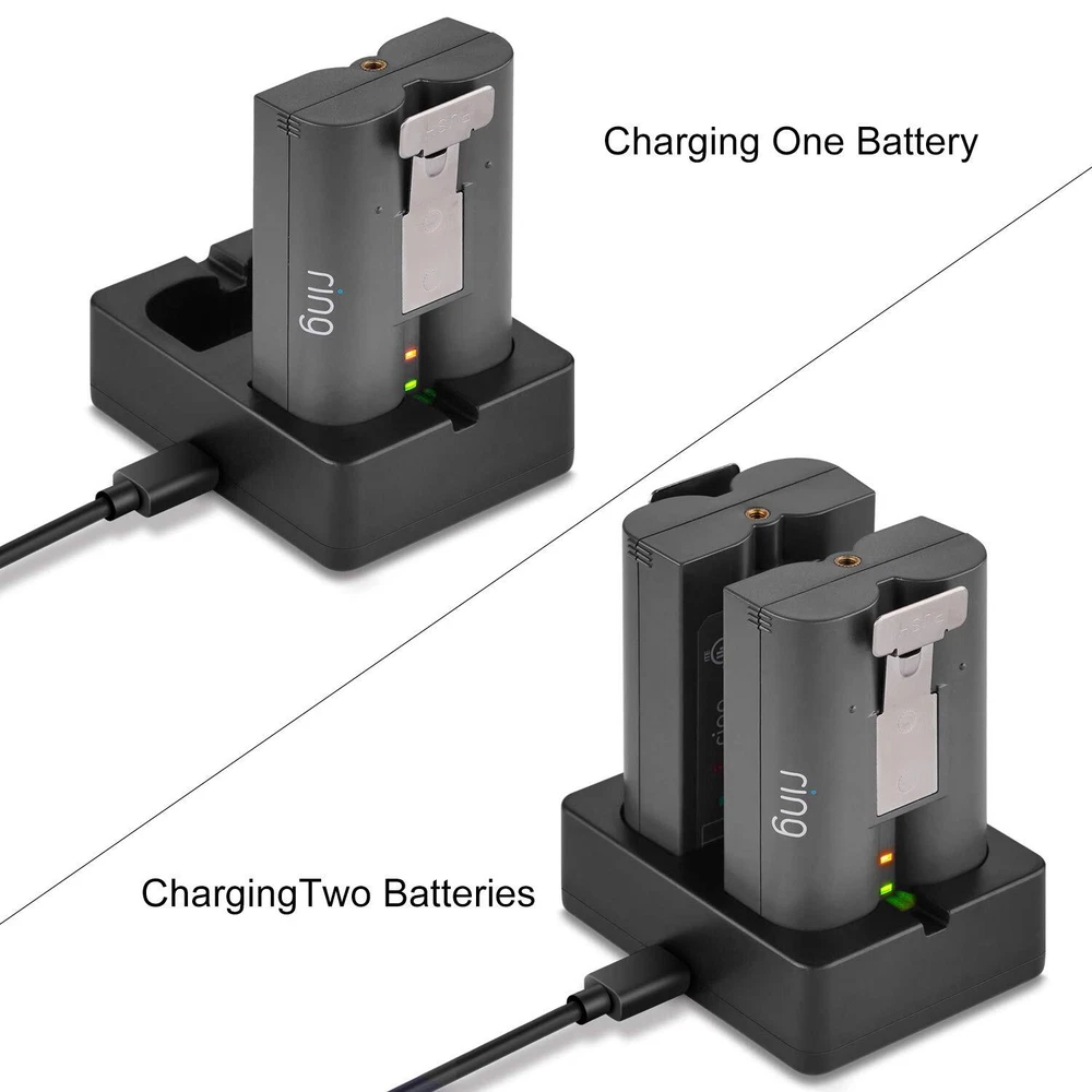 2-Port Charging Station for Ring Video Doorbell 2 and Spotlight Cam Batteries High Compatibilty 【MULTPLE CHARGING AT ONCE】 This Ring battery station can charge up to 2 batteries simultaneously, allowing you to change the batteries of your cameras via hot-swap and thereby reducing the downtime of your Ring. (NOTE: Ring batteries not included) 【THOUGHTFUL DESIGN】 Our patent-pending design allows you to easily look Ring batteries indicator lights that show whether the batteries are charging or are fully charged. 【EXCLLENT QUALITY】 Ring Rechargeable Batteries can slide easily in and out of the dual charging station, and each battery is charging individually, you can choose to charge only one or two backup batteries at the same time. 【 FCC CERTIFIED】 The Dual Port Charging Station good quality fire shell material and built-in safeguards, provides a short-circuit protection and effectively ensures safe charging, against over-heating, over-current and over-voltage. 【PACKAGES INCLUDED】 1 x Dual Charging Station; 1 x Power Cable. Note: Ring Rechargeable battery is not included. You can enjoy 12months warranty for this 2-Port Charging Station. If any problem, feel free to contact us. We'll surely help you and make you satisfied.