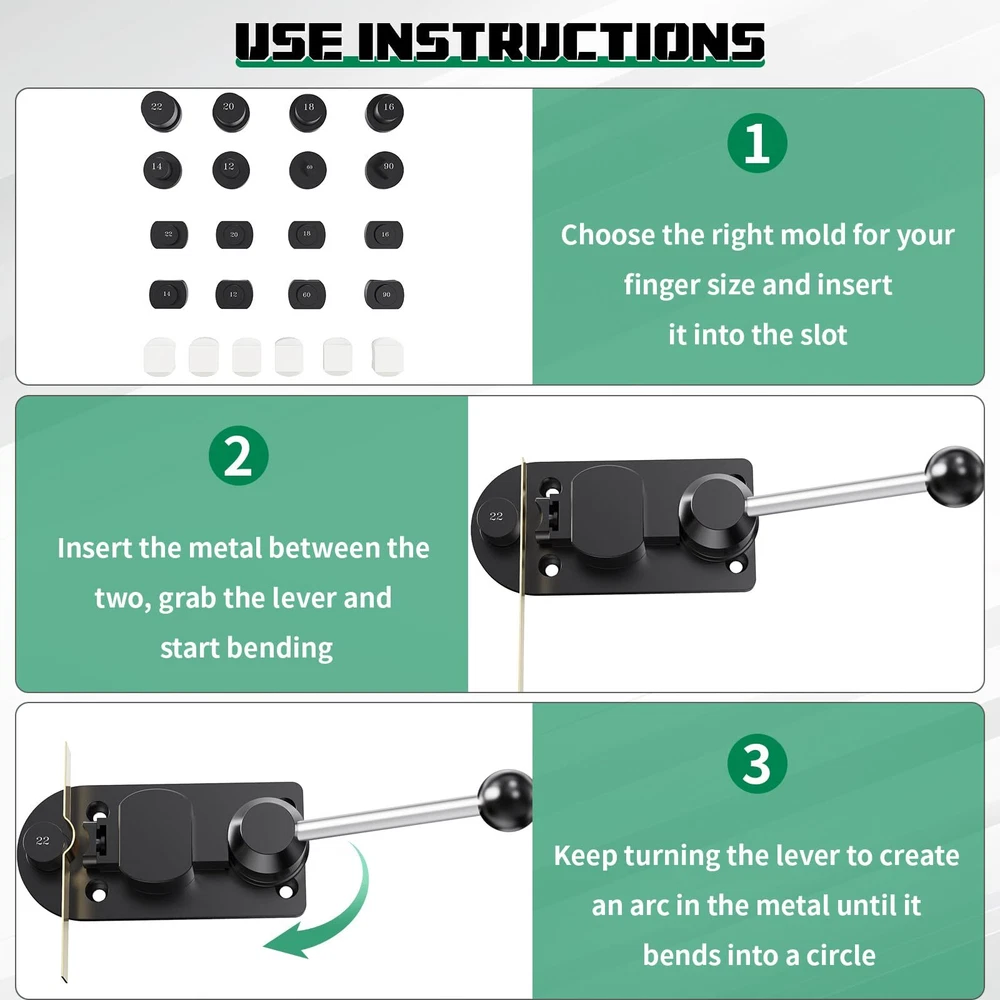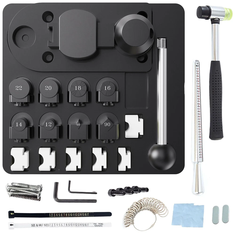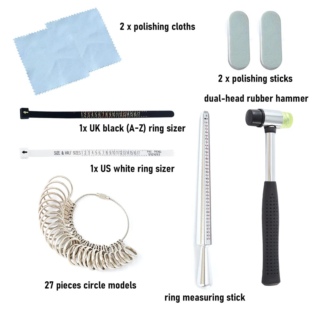 【What You Will Get】The spoon ring making kit comes with dual-head rubber hammer and Ring Sizer Measuring Tool(including Metal Finger Sizer Measuring Ring Tool and Aluminum Ring Mandrel 4 Measurement Size), equipped with a set of six white nylon dies, US&UK ring size gauge,polishing rods and cloth, which may be needed when you are making rings.Perfect gift for craft lover. 【Upgraded Rod &Ring Bender】We upgraded the rod of the ring bender (diameter 0.8cm increased to 1.0cm) to avoid the rod breaking, so that spoon ring bender can have a longer service life.The ring bending tools are made from solid steel and then hardened to 45-50 HRC.each steel post and die(Six matching precision columns and dies of sizes 12, 14, 16, 18, 20, and 22 MM, as well as dies of 60 and 90 degrees and a convenient organizer base in matching form. )are black oxidized, no corrosion for life. 【4 Size Ring Sizer Measuring Tool】The ring bender tool for spoon rings specially designed for measuring rings comes with 4 sizes: US sizes of 1-15 (Specific to quarter size), European size (CU 41-76 ), Japanese size (m/m∮1-34), FR Standard Size 1-36. which can meet the measurement needs of different sizes of fingers. 【Exceed Higher Quality】The 27pcs ring sizer gauge set is made of stainless steel material for long time using, Each ring is laser engraved with USA Sizes 1-13 including 1/2 half size increments. The flexible cable with a screw connection for you to open if needed.Other ring making tools are used for different size measuring, sanding and polishing jewelry to a shine and sparkle. 【Wide Application】The jewelry ring bender tool can bend rings, spoon rings, earrings, and so on. It is suitable for jewelry DIY, jewelry repair, jewelry design, home hand-made,or jewelry stores. we recommend this ring bending tool for soft metals less than 3mm thick. And the whole set is popular both in professionals and beginners. Very easy to use that time saving and labor-saving. Note: Ring bending tool must be fixed directly to your workbench by using screws or if you have a fixed bench vice, the ring bender can be placed on top of the vice jaws.