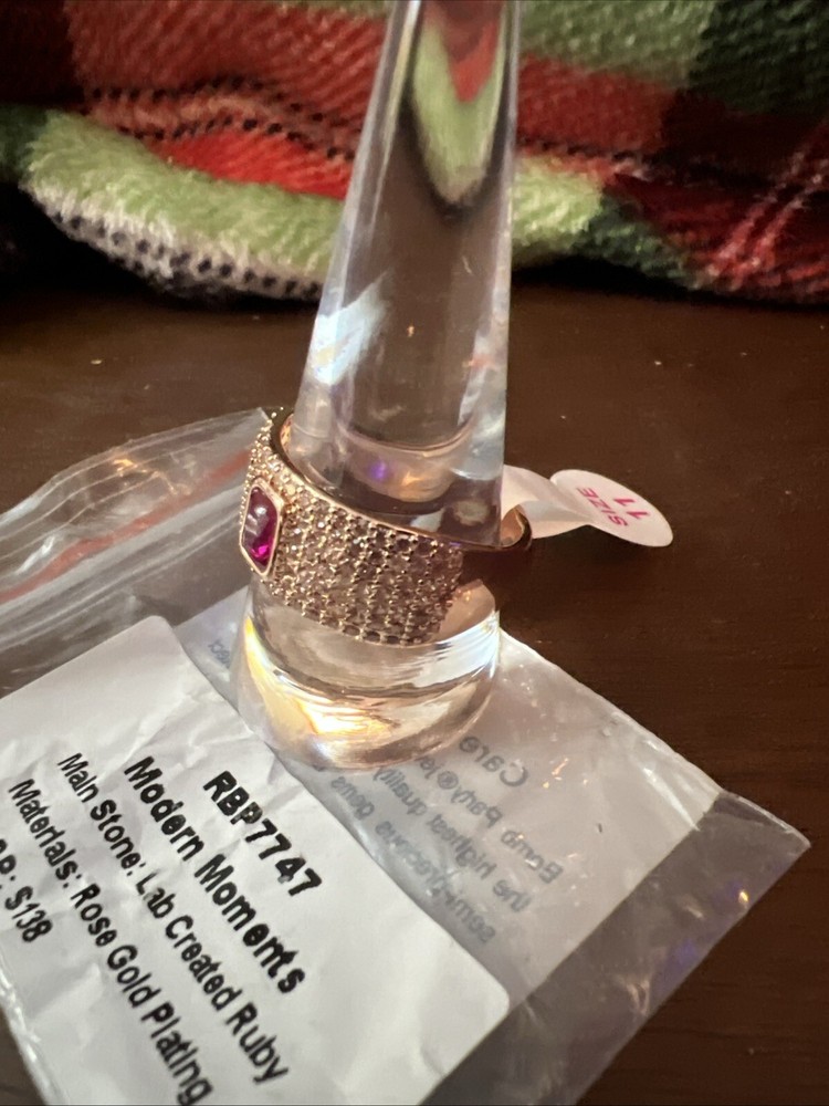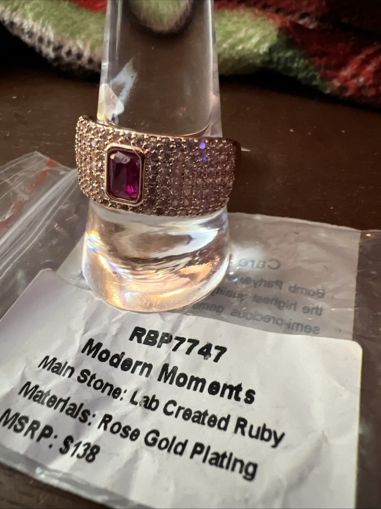 RBP7747 Modern Momems Main Stone: Lab Created Ruby Materlals: Rose Gold Plating MSRP: $138 Introducing the Ring Bomb Party RBP7747, a stunning piece of jewelry designed for the modern mom. This ring features a beautiful emerald-shaped lab-created ruby that is sure to catch the eye. The band is made of high-quality gemstone material and plated with rose gold, giving it a sleek and stylish look. With a ring size of 11, this band is perfect for those who want a comfortable fit. The Ring Bomb Party RBP7747 is a must-have for anyone who wants to add a touch of elegance to their wardrobe. This ring is designed in the USA and is of the highest quality. Don't miss out on this amazing opportunity to own a piece of jewelry that is sure to make a statement.