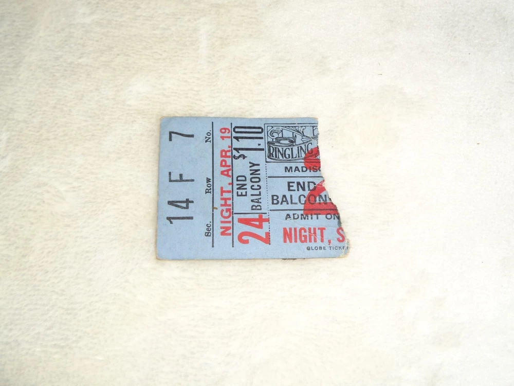 Ringling Brothers Barnum & Bailey Circus Madison Square Garden 1930s Rare Ticket Measures approximately 1 1/2" x 1 3/4". Ticket has been torn along the right side. Right edge is uneven. There is paper and glue residue on the reverse side, as this was removed from an old album or scrapbook. Item has creasing, discoloration and marks from age and storage. Please see photos for more information on condition and ask any questions you may have.