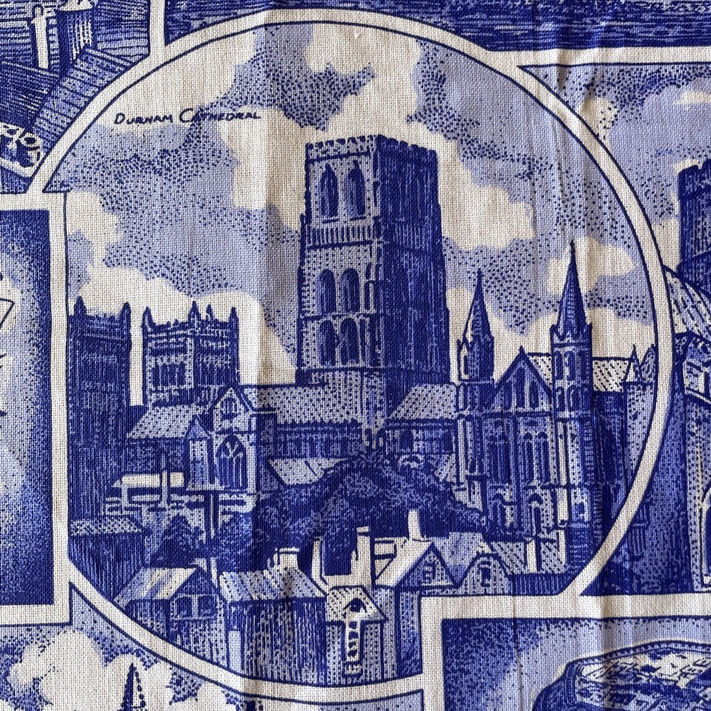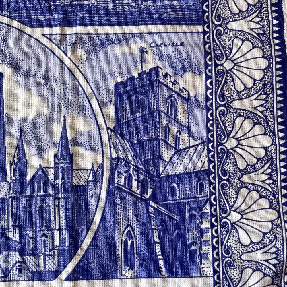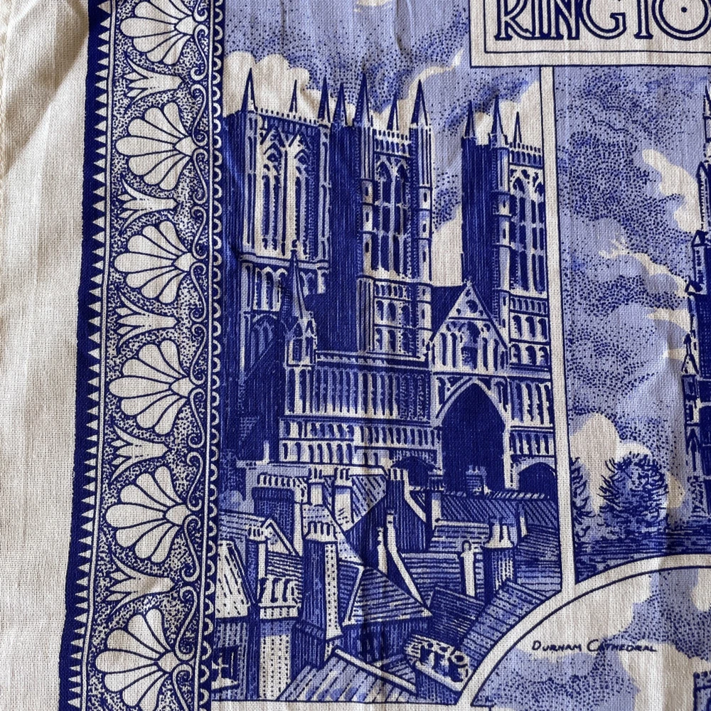 The product is a blue cotton tea towel featuring the iconic Ringtons Ltd brand, with a design of castles and cathedrals. This rectangular tea towel is machine washable up to 140°F and is made in Ireland. Perfect for adding a touch of Topographical & Souvenir theme to your kitchen decor, this high-quality kitchen and tea towel is a must-have for any adult's home.