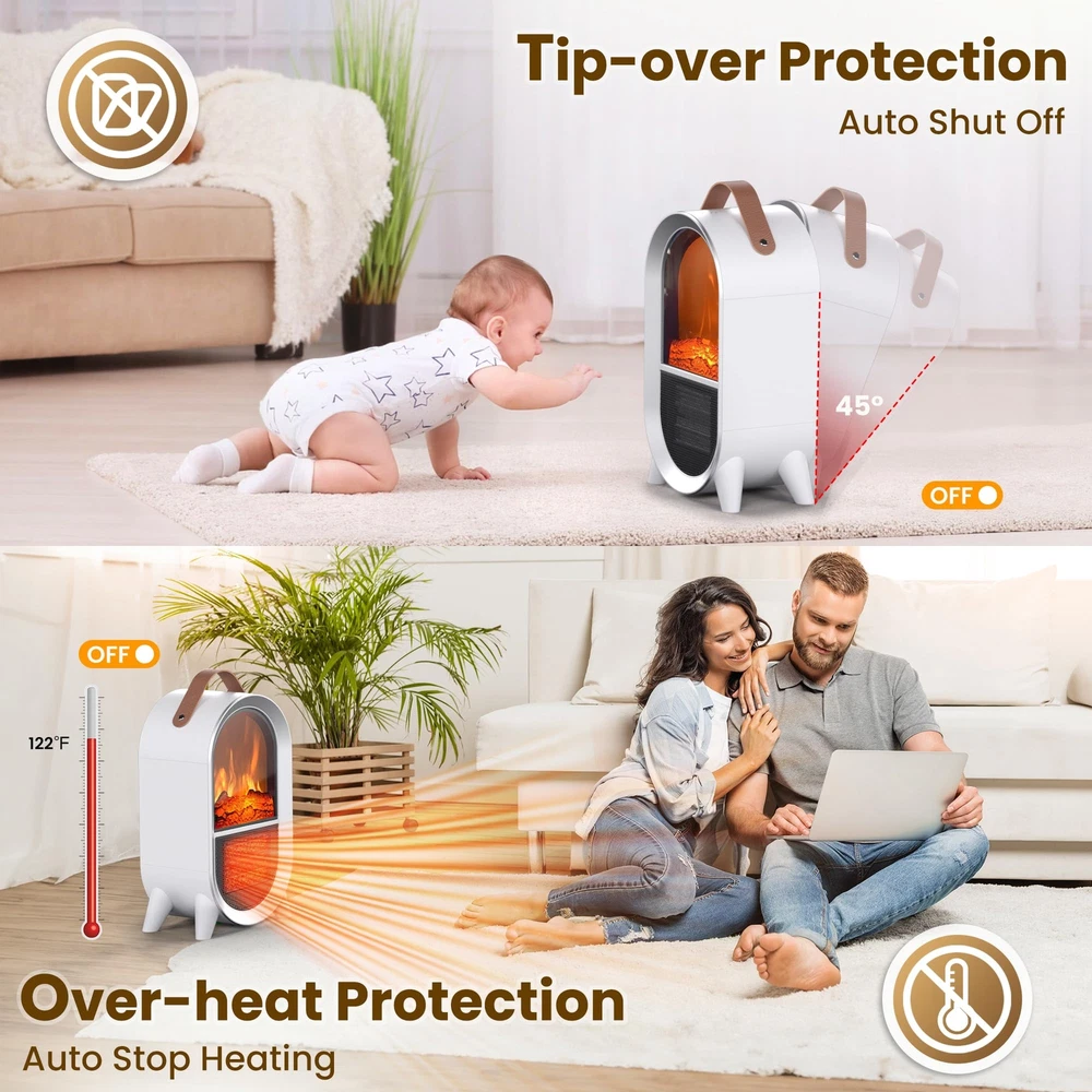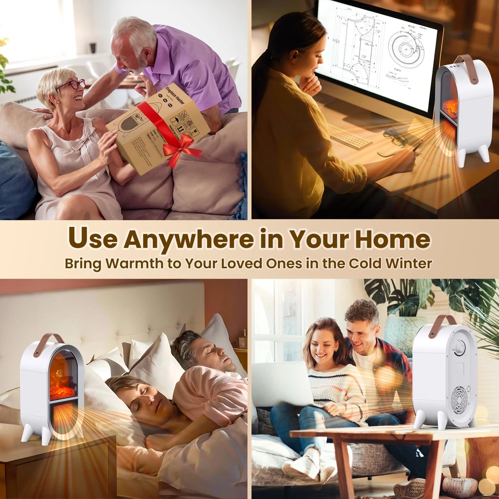 2-IN-1 SPACE HEATER FAN: This small space heater utilizes ceramic heating technology and offers two heating levels, 1500W or 750W and a cool air fan that you can use in both winter and summer ADJUSTABLE THERMOSTAT: Adjust the thermostat to MIN, the heater will keep blowing cold air, adjust the thermostat to MAX, the heater will keep blowing hot air, with the thermostat in the middle, the heater will blow air to dissipate once the heater reaches the preset temperature, and then blow hot air again when the temperature falls below the thermostat setting REALISTIC 3D FLAME: This portable electric heater uses resin simulated charcoal to create a realistic 3D dynamic flame without smoke or noise, creating the ambiance of a real fireplace, adding warmth and comfort to your home TIP-OVER & OVERHEAT PROTECTION: This small fireplace heater is made of flame retardant material which effectively reduces any fire hazard. The overheat protection automatically shuts off the heater when it reaches a critical temperature. The tip-over protection system also shuts off the heater when it is accidentally knocked over, and after righting the heater, the heating function needs to be turned on again for added safety, perfect for families with children and pets PORTABLE AND POWERFUL: Our mini heater comes with a carrying strap, allowing you to easily move it to the space you want. Whether it's for your bedroom, living room, study, office or other space, its light weight and convenient design make it the best partner in winter