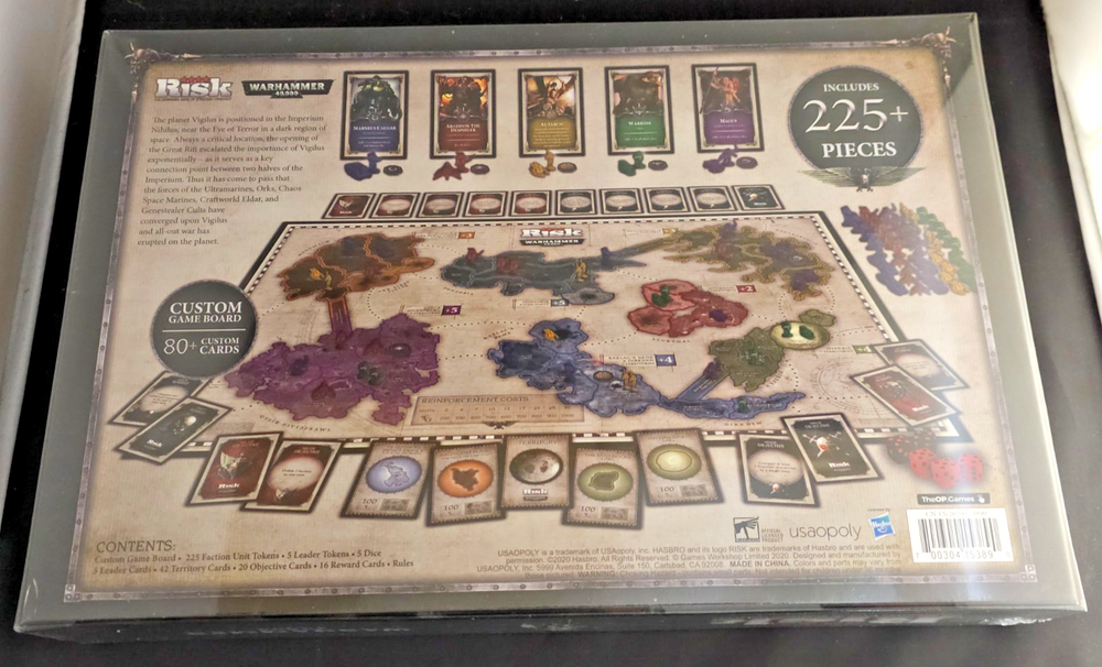 Battle with your favorite factions for control of the planet Vigilus in the Battle of the War of the Beasts. Take control of your faction and attempt to vanquish your foes across the unique planet map that has been customized for Warhammer fans. In this Risk game, custom sculpted units will allow you to control the key locations in your bid to rule the planet! Prepare for the Battle of the War of the Beasts on the planet Vigilus with your favorite factions from Warhammer 40,000 in this custom version of Risk Take control of familiar areas as you attempt to defeat your foes with custom-sculpted units This collectible Risk game is officially licensed and sure to be a great collector’s gift for Warhammer fans Includes: 1 Custom Game Board, 225 Faction Unit Tokens, 5 Leader Tokens, 5 Dice, 40 Territory Cards, 20 Objective Cards, 16 Reward Cards, Rules Player 3-5 | Age 10+ | 60+ Min Play Time