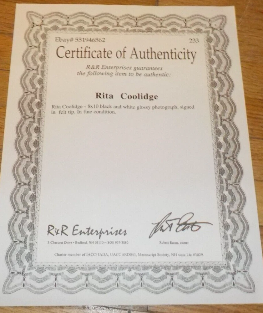 Rita Coolidge signed photo, 8" x 10", COA, B&W