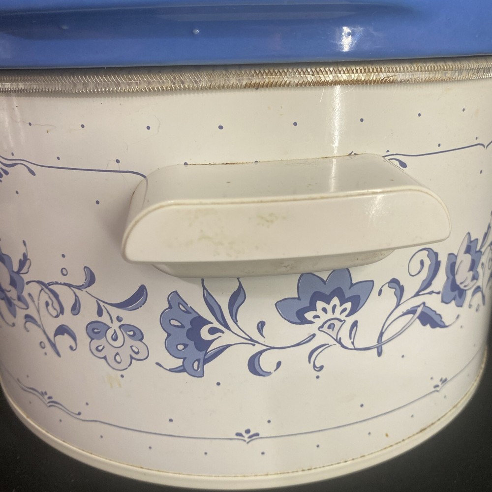 This Rival Crock Pot Stoneware 4 Qt. Slow Cooker Model 3154 is a vintage gem that will add character to your kitchen. The electric cooker is made in the United States and comes in a beautiful blue color with a glossy finish. It has a 4 qt capacity and is made of durable stoneware material. The slow cooker features non-slip feet and can be powered on or off with three different settings/programs. It does not come with a lid, but it is still a great addition to any kitchen. The components included are the pot and base. This Crock-Pot is perfect for those who enjoy cooking and want a reliable and versatile appliance. Has light scratches/ wear / discoloration to the finish. Has some staining to bottom of crock.