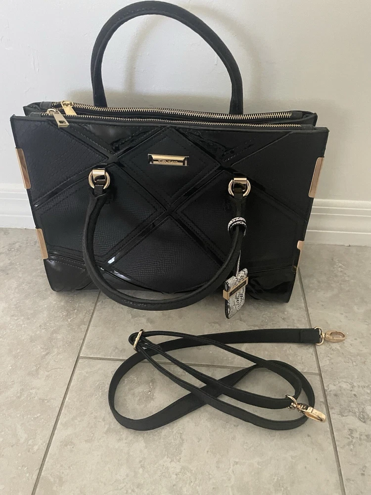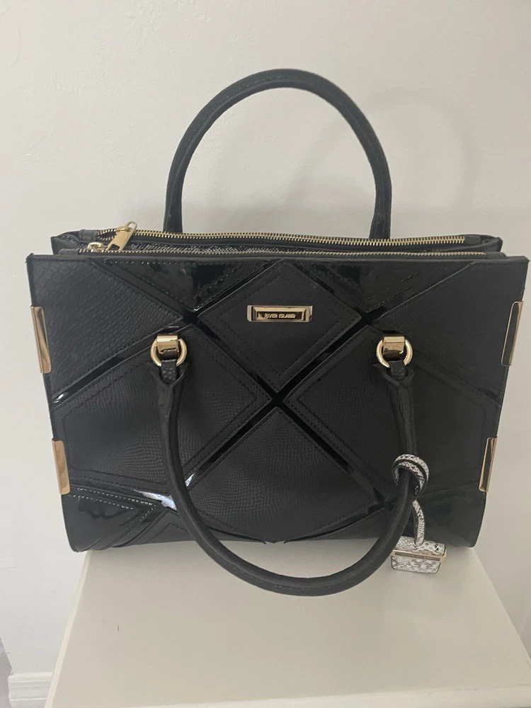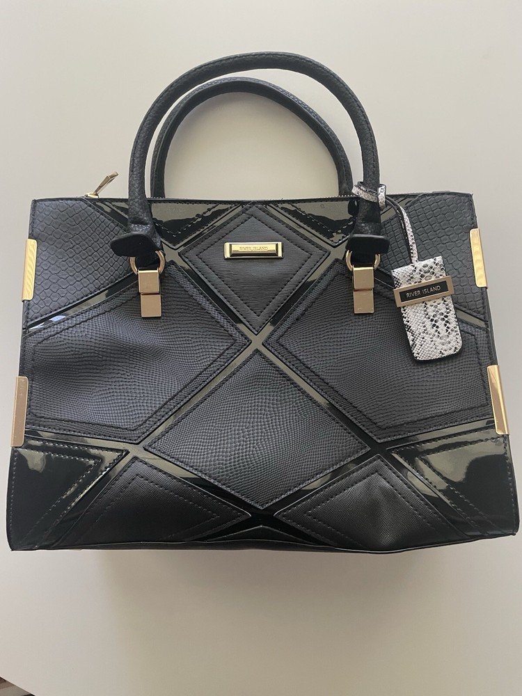 This is a stylish shoulder bag by River Island for women. It features a black faux leather exterior with gold details, including a gold handle/strap and gold lining. The hardware is black, adding a touch of contrast to the design.
