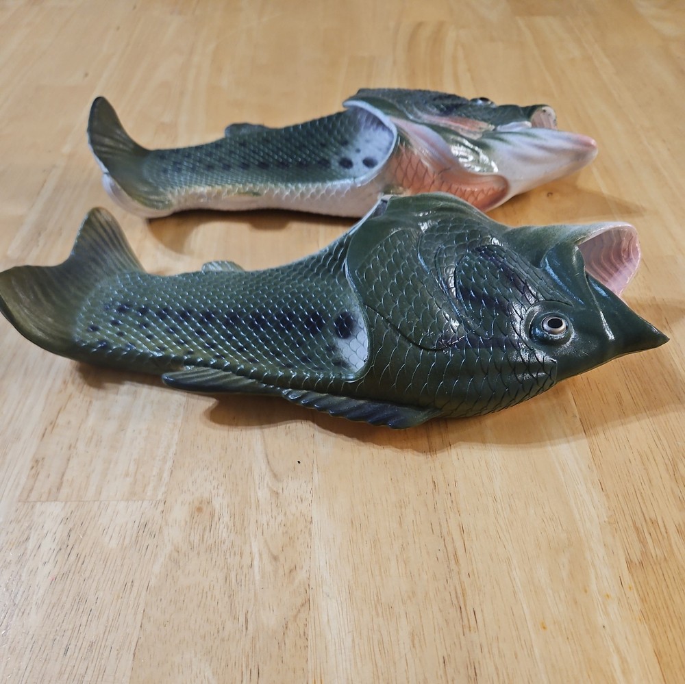 These Rivers Edge Bass Fish rubber slide sandals are designed for men in size 11/12 M. Featuring a fisherman character and fish pattern, these green sandals have a vintage style with a colorful and fun design. Made with a rubber outsole and upper material, these slide sandals are perfect for outdoor activities. The slip-on style and adjustable features make them easy to wear for any man looking for a unique and stylish footwear option.
