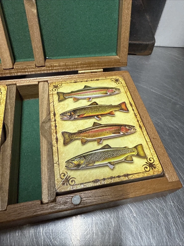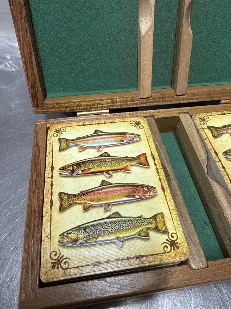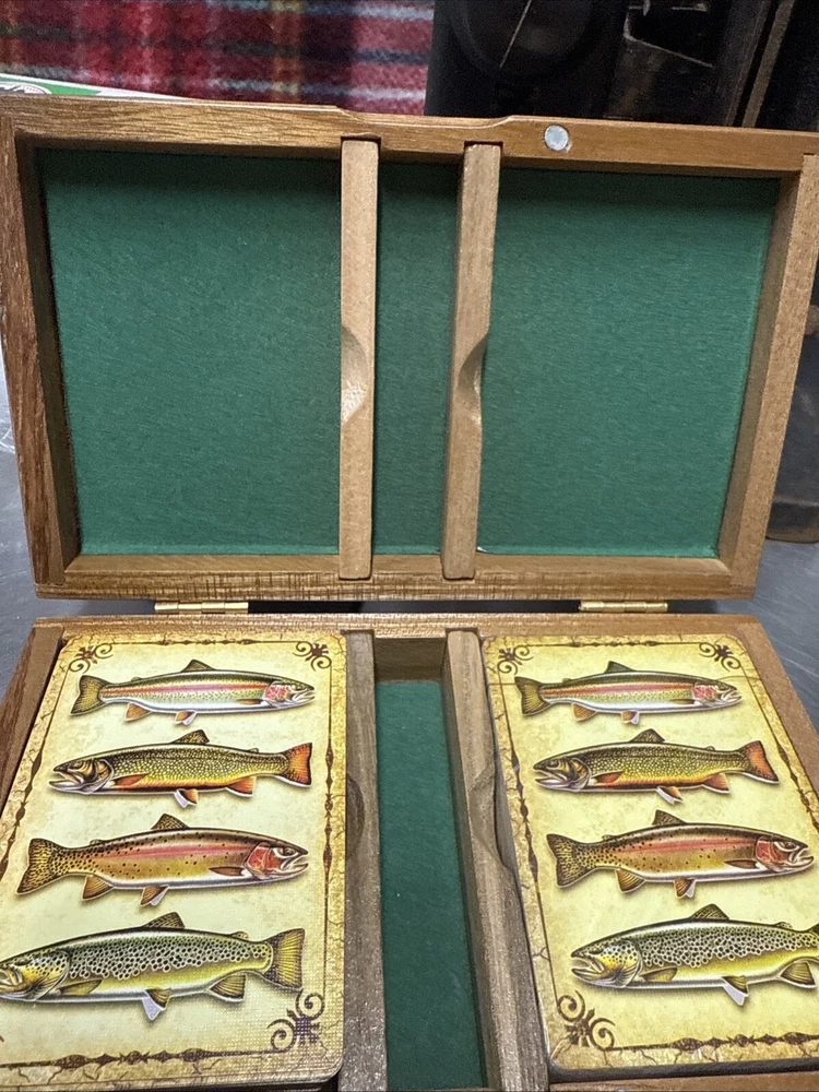 Country/Region of Manufacture:UnknownTheme:FishingBrand:River's Edge ProductsDimension of Box:7" long x 4" wide x 1-1/2" deepAge:UnknownFeatures:2 Decks Of Cards No Dice