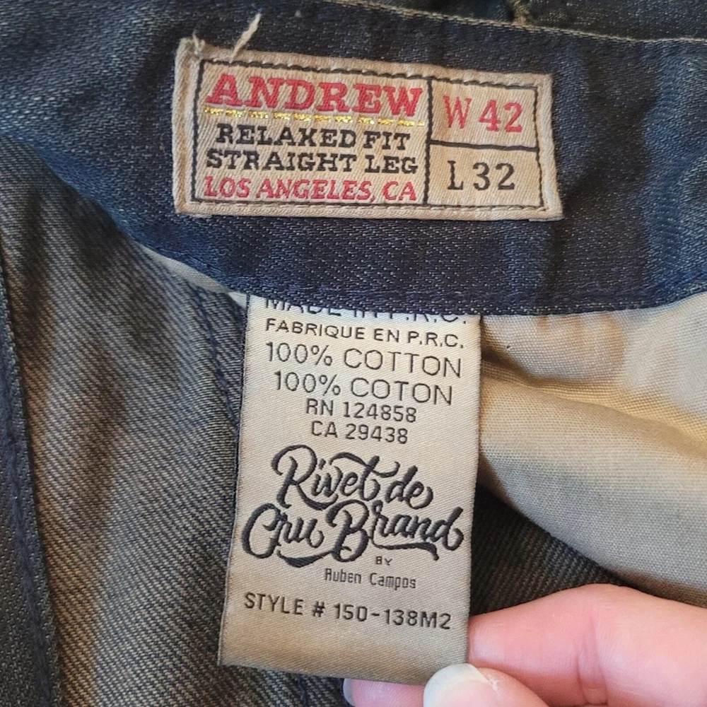 Rivet De Cru Jeans Men's Size 42/32 Andrew Relaxed Fit Straight Leg Distressed Measurements are included in the photos Elevate your denim game with these Rivet De Cru Jeans in Andrew style. With a relaxed fit and straight leg design, these jeans are perfect for any casual occasion Distressed Faded, Whiskered Crafted from high-quality materials, these jeans are durable and made to last. Ideal for men who appreciate classic style with a modern twist, these jeans are perfect for pairing with your favorite sneakers or dress shoes Sold at the Buckle & other retailers Excellent pre-owned condition Bundle for a discount, or send an offer