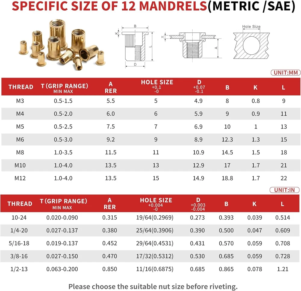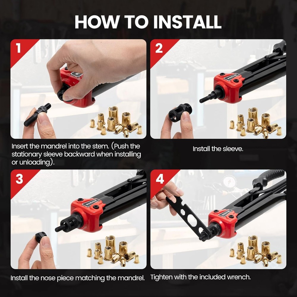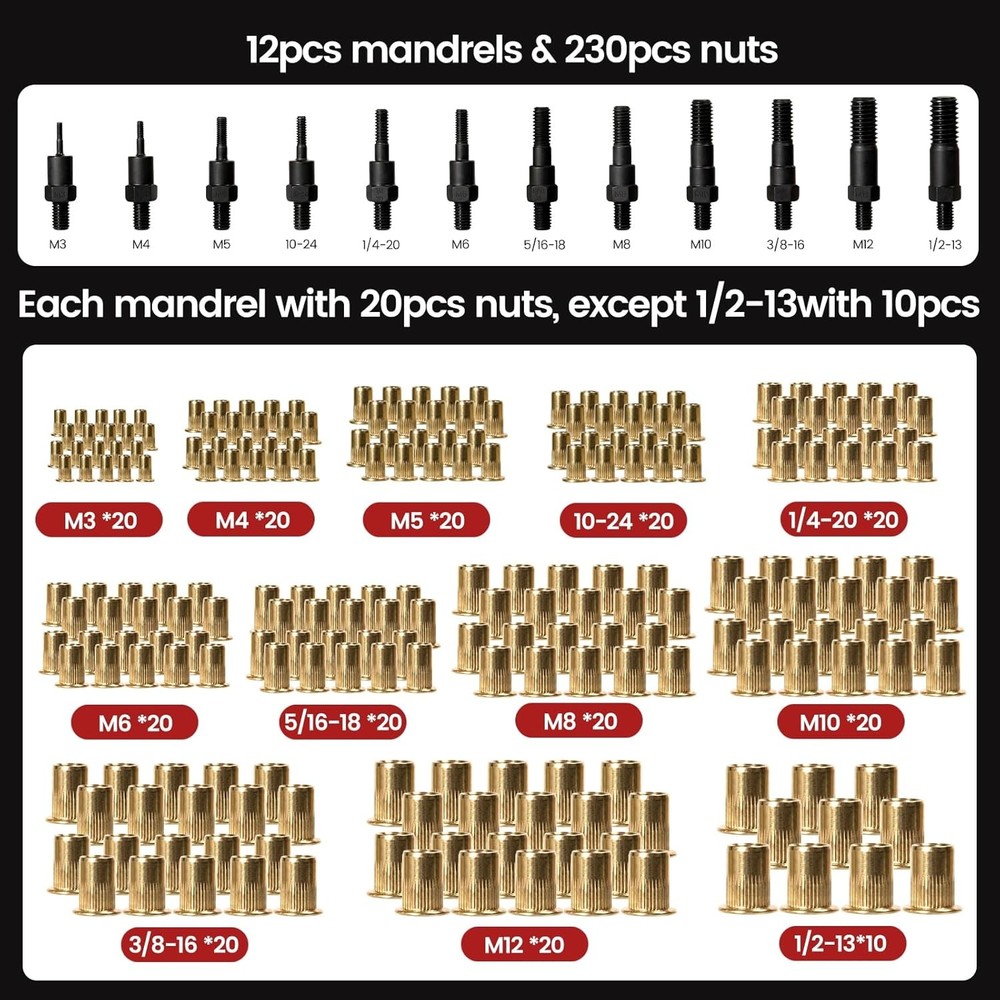 Free eBay listing template designed by dewiso.com Rivet Nut Tool, 16" Heavy Duty Rivnut Tool Kit with 12PCS Metric/SAE Mandrels, 230PCS Rivet Nuts, Wrench, Gloves and Carrying Case, Auto Release Nut Design for Automotive, Construction & DIY FREE AND FAST SHIPPING! 【Complete All-in-One Kit】 This rivet nut tool kit includes a 16-inch rivnut tool, equipped with 12 mandrels (metric M3, M4, M5, M6, M8, M10, M12; SAE 10-24", 1/4-20", 5/16-18", 3/8-16", 1/2-13"), 230 nuts, plus a multi-functional wrench, a pair of gloves and an operation manual. 【Labor-saving Design】 Engineered with a handle connecting rod design, our rivet nut tool automatically releases the rivet nut after just 2–3 squeezes. It is equipped with an ergonomic anti-slip and curved rubber-coated handle, which is comfortable to hold and not easy to fall off. 【Superior Quality】 The professional nutsert tool kit handle is made of carbon steel and processed through high-temperature heat treatment, featuring excellent corrosion resistance and anti-deformation performance, with a long service life. 【Wide Application】 This heavy-duty rivet nut tool set is ideal for the fastening and riveting of metal plates and pipes, and widely applicable to assembly and maintenance work across multiple fields such as automotive, electronics, and construction, with strong practical compatibility. 【Convenient Storage】 The set is equipped with a sturdy blow-molded outer box, which is portable and durable. Metric and imperial nuts are respectively placed in two white PP boxes, and the mandrels are placed in separate plastic boxes marked with specifications for easy search and maintenance. Product We offer a 30-Day Return Policy on items which you are not completely satisfied with. You have the option for a full-refund or an exchange of the item. No returns are available on items shipped outside of the US . Shipping We offer Free Shipping to the US and ship within 2 business days of payment, usually sooner. We use UPS express shipping. That's why your products are usually delivered within 3 days . Contact We try our very best to make sure every customer is completely satisfied. If there's a problem , message us! We're happy to help. 24/7 live chat available.