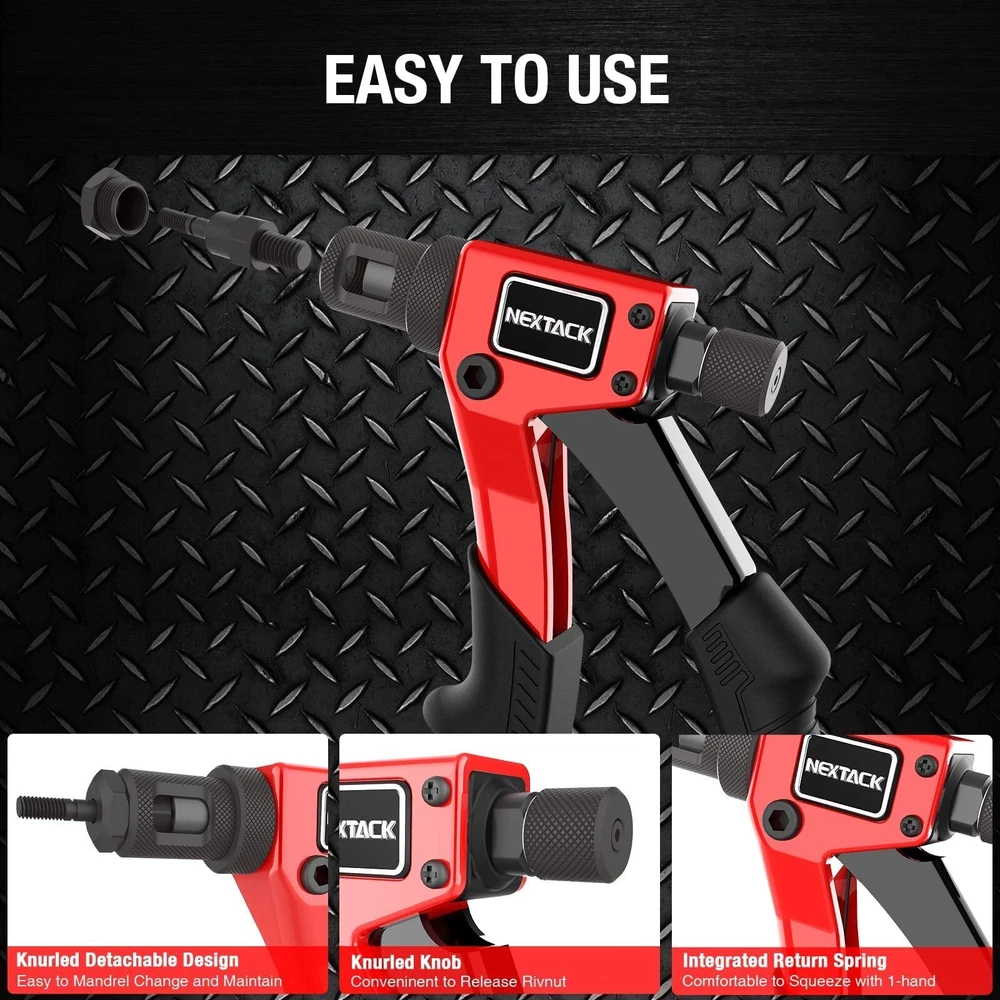 【Compact Design for Tight Space】The 8 inch right angle style make it easy for grab-and-go to solve out-of-reach riveting projects for confined narrow spots. it is ideal solution for small rivnut with single hand riveting, and for bigger rivnut attached like M6 & 1/4-20, it is better to use both hand operating. 【One-Stop-Solution】The nutsert tool kit is packed in a well-organized compartmented case for safe storage and convenient portability. It comes with a step drill bit, 8 universal interchangeable mandrels (4 SAE 6-32, 8-32, 10-24, 1/4-20 and 4 Metric M3, M4, M5, M6), 80 carbon steel threaded nuts (10 for each mandrel), & a professional user manual. 【Built to Last】The threaded insert hand riveter consists of quality steel arm with blacken and heating treatment, aluminum alloy body, and thick non-slip PVC grips. It prevents from corrosion and deformation and prolongs the lifecycle to ensure the strength, durablity and reliablity. 【Easy to Use】The nutsert rivet gun features single hand operation and modular detachable design for easy riveting, mandrels changing and maintenance, rotary knob structure for easy nut loading and releasing. 【Versatile Application】The threaded insert riveter tool kit can help you add attachedment with bolt on working piece like metal, fiberglass in different occasion like van wall, metalworking, railway, aviation, bicycle, off-road, RV and home modification. 【Warm Tips】Please note the mandrels are consumable and may be damaged with uneven pressure and improper use. We have addtional replacement mandrels M3 M4 M5 M6 6-32 8-32 10-24 10-32 1/4-20 here in our store. If any issue during using please message us.