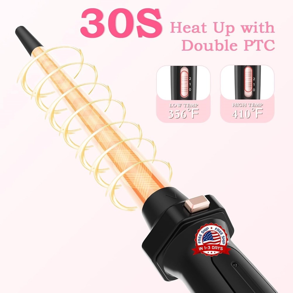 Rizador versátil: el rizador ofrece opciones de peinado versátiles y personaliza tu look con cinco barriles de precisión, que incluyen un barril cónico de 0,35 a 0,71 pulgadas, un barril de rizo de 0,5 pulgadas con clip, una varilla rizadora de 1 pulgada, un barril de rizo de 1,25 pulgadas con clip y una plancha de pelo especializada para mayor flexibilidad de peinado. Ya sea que estés alisando o rizando, cabello largo o corto, este set todo en uno lo tiene cubierto. Calentamiento rápido de 30 segundos y 2 configuraciones de temperatura: Estos rizadores de cabello logran resultados dignos de un salón de belleza en segundos con la tecnología de calentamiento instantáneo doble MCH, perfecta para mañanas ajetreadas o retoques de última hora. El ajuste de temperatura de dos niveles (350 ℉ - 410 ℉) satisface completamente las necesidades del cabello de tipo delicado a grueso. Consigue rizos duraderos: Fabricado con la varilla rizadora de cabello con revestimiento cerámico que garantiza una distribución uniforme del calor para rizos impecables. Sin daños por sobrecalentamiento, reduciendo la electricidad estática y manteniendo el cabello liso. Un alto alcance de calor de Hasta 210 °C para rizos duraderos. Disfruta de libertad de movimiento con su cable giratorio de 2,4 metros antienredos. Incluye un guante resistente al calor y pinzas de regalo para mayor comodidad al peinar. Reemplazo fácil del cilindro: Su diseño de instalación rápida facilita el cambio del cilindro para crear diferentes estilos de rizos. Las puntas resistentes a las quemaduras y los guantes resistentes al calor protegen tus manos del calor. Doble voltaje y regalo perfecto: Este rizador de doble voltaje (110-240 V CA) es perfecto para viajar, lo que lo convierte en el compañero ideal para crear tus propios peinados en cualquier momento y lugar. Un regalo único para su cumpleaños, San Valentín y Navidad.