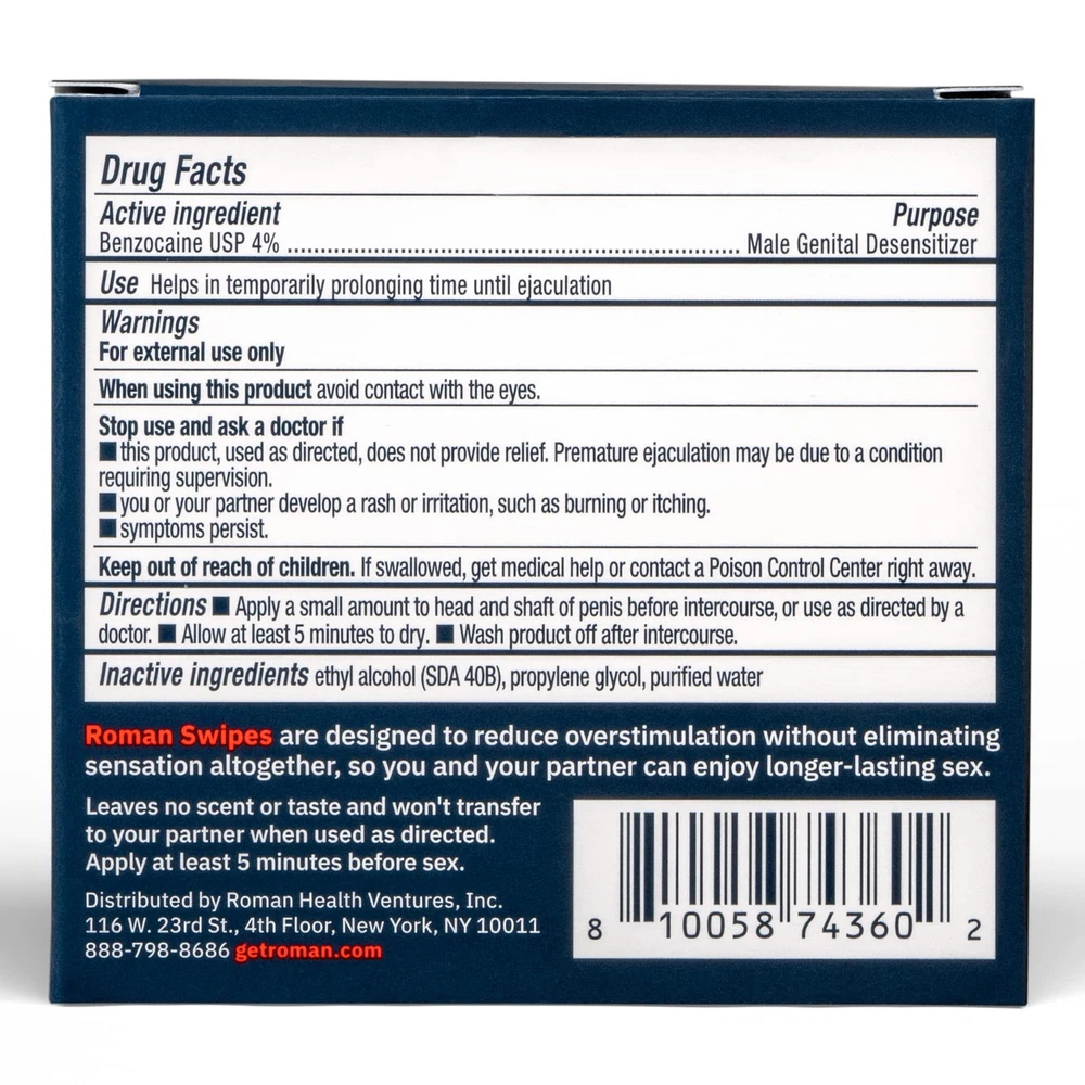 Ro Swipes | Fast-Acting, Convenient, Over-The-Counter 5 Count (Pack of 1) Product Details LAST 4X LONGER: Roman Swipes, with benzocaine, make you last 4x longer, helping reduce sensitivity so you can feel confident in your ability to perform. SUPPORT PERFORMANCE: Increase your stamina and endurance in bed.