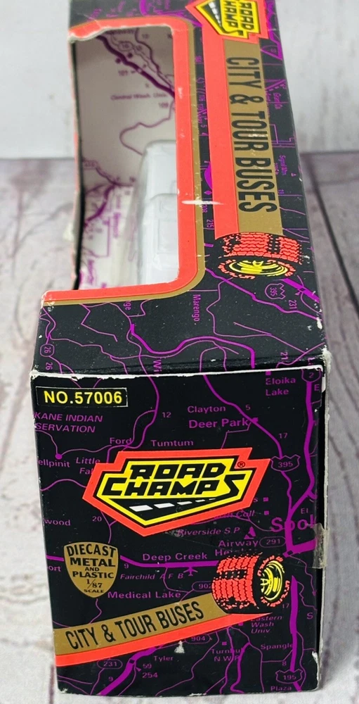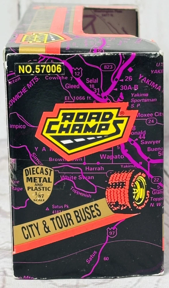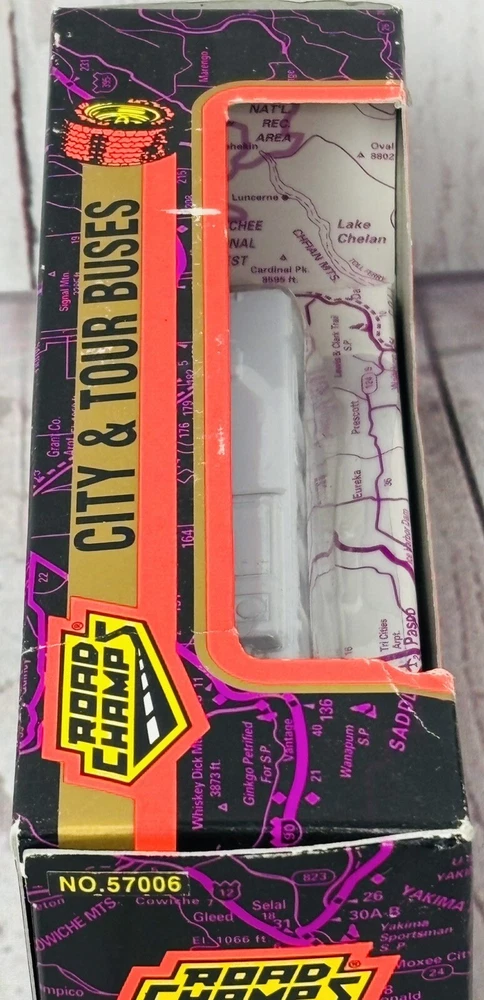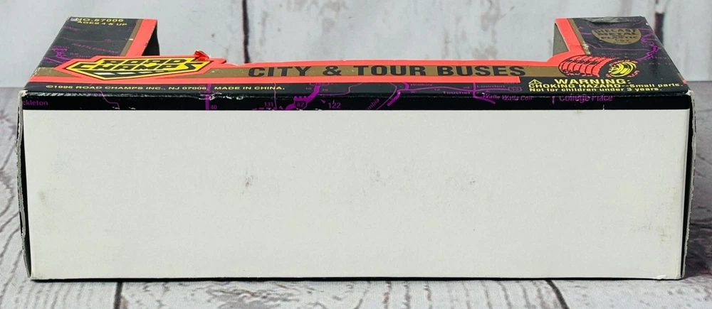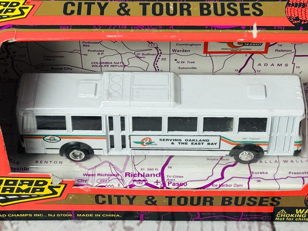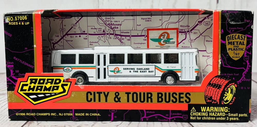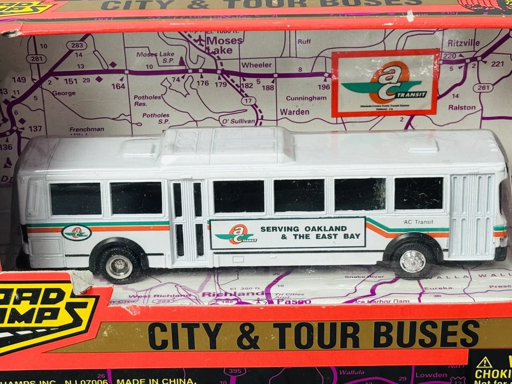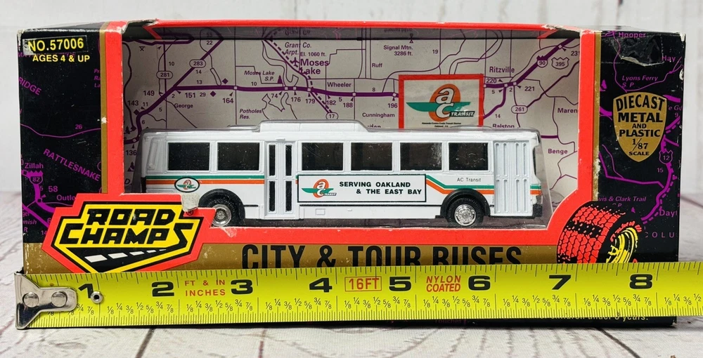 This is a rare 1996 Road Champs City & Tour Buses diecast model of an AC Transit bus serving Oakland & the East Bay. It is a 1:87 scale model made of diecast metal and plastic. The bus is in new, unused condition, still housed in its original packaging. Please note that the box shows signs of wear, including minor scuffing and edge wear, but it still displays well and securely holds the bus. This is a hard-to-find collectible, perfect for diecast enthusiasts or those with ties to the Oakland East Bay area. Don’t miss this chance to own a piece of transit history!