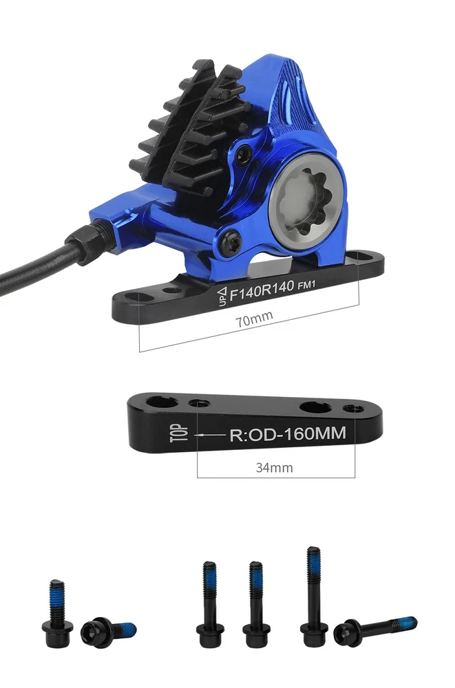 Material: aluminum alloy Weight: about 252g for the front brake, about 272g for the rear brake Length: Front brake 850mm, rear brake 1550mm Brake rotor compatible with 140mm/160mm Features: It is used to modify the flat handlebar brake of road bicycles. The bilateral synchronization keeps the brake rotor in the middle and is not easy to deform, and the brake is more stable.