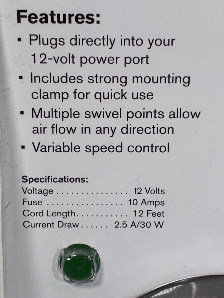 Color: Black Control Style: Switch Room: Any Room Type: Tornado Fan Item Depth: 12 in Power Source: 12 Volts DC Auto Suitable For: Indoor Features: variable speed, mounting clip Timer Control: Timerless Material: Plastic Power: 30 W Number of Blades: 3 Blade Orientation: Axial Voltage: 12 V Mounting: Clip-On Brand: RoadPro
