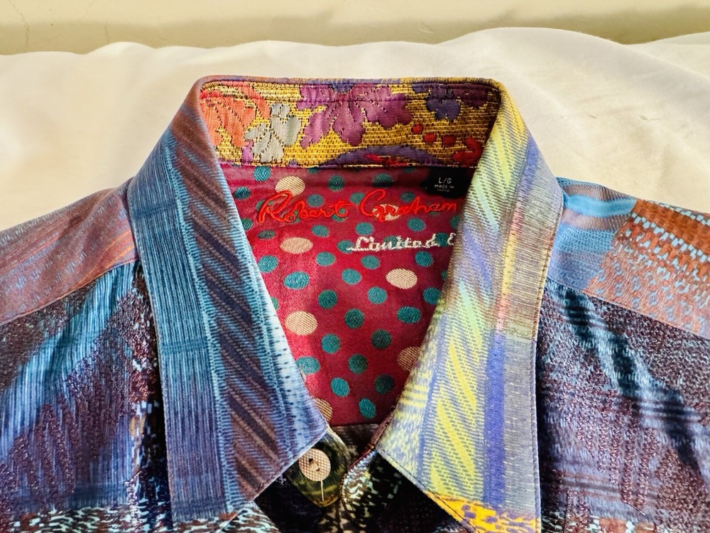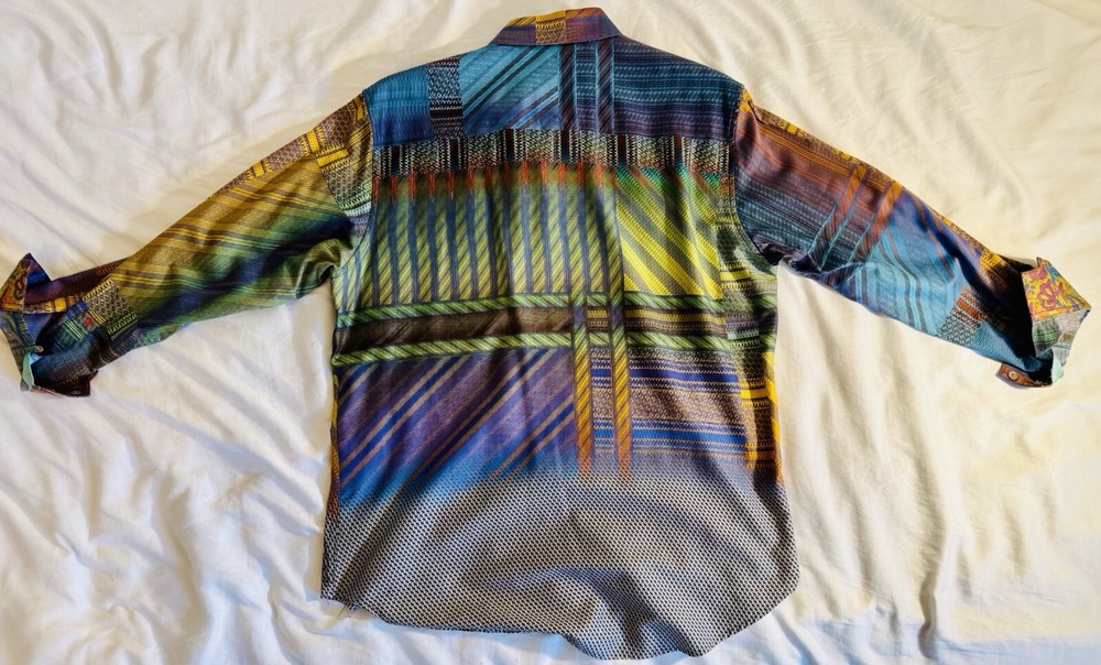 A rare Robert Graham Limited Edition multi design colorful Shirt. The colorful party and festive pattern, embroidered accents, and spread collar make this shirt perfect for any occasion, whether it’s special dinner, a party, special event or formal occasion. The long sleeves and knit fabric make it suitable for any season, while the button closure adds a touch of classic style. This shirt is a large size and fits perfectly. Easy to maintain - made of machine washable cotton and is perfect for men who appreciate a comfortable, yet stylish shirt. Don’t miss out on this unique piece to your collection and wear it proudly.