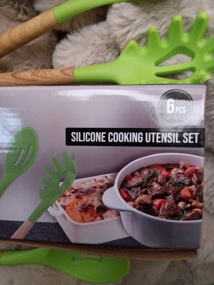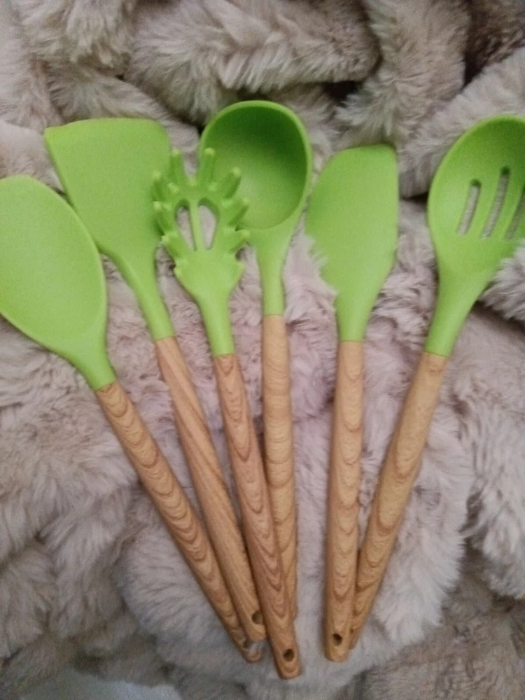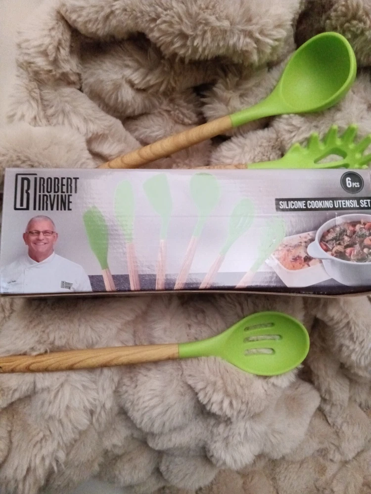 The Robert Irvine Green Silicone Kitchen Cooking Utensil Set includes 6 items with black silicone material and wooden handles. The set features slotted spoons, skimmers, ladle, turner, and spatula. Perfect for cooking and kitchen use, these utensils are durable and easy to handle. Solid (not hollow) wooden handles. Enjoy FREE SHIPPING:-)