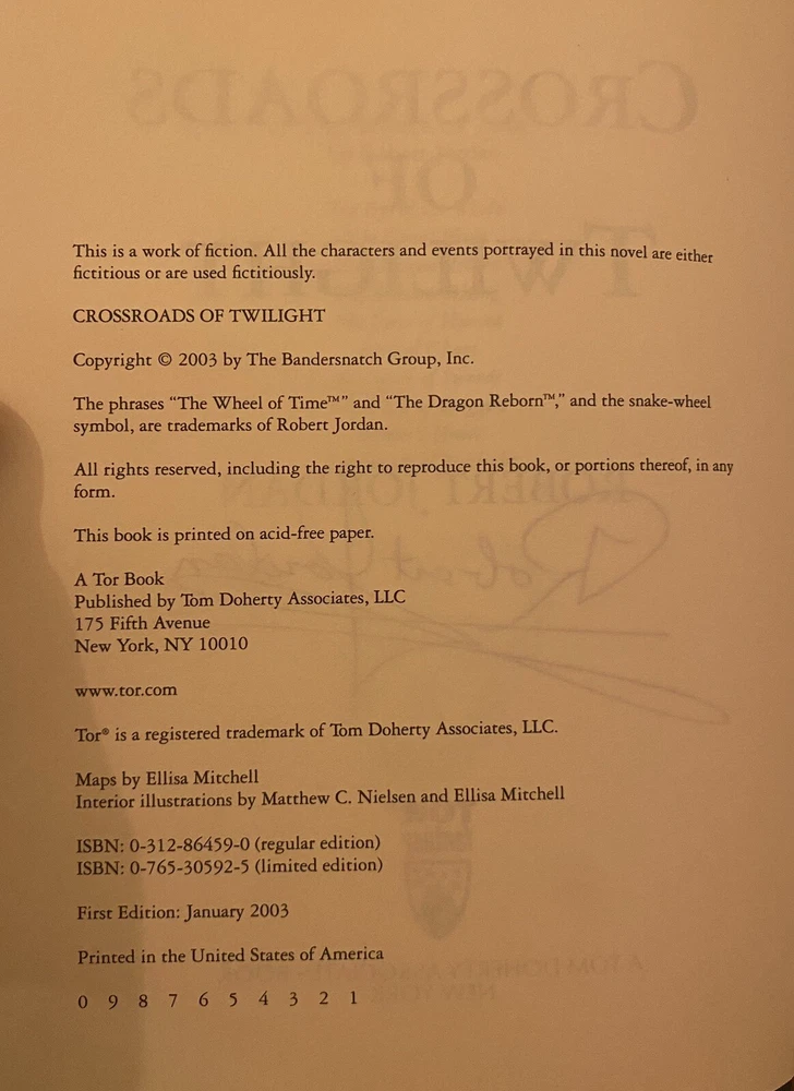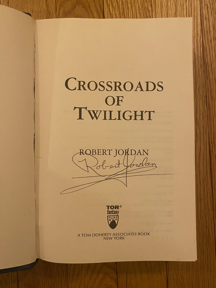First edition copy of Robert Jordan’s Crossroads of Twilight signed by the author. Book is in presentable condition with notable shelving wear to the dust jacket. Book also has some minor foxing wear on the tops of some pages. See pictures. Book will ship securely in a padded bubble mailer to ensure protection. If you have any additional questions, please message me prior to purchase.