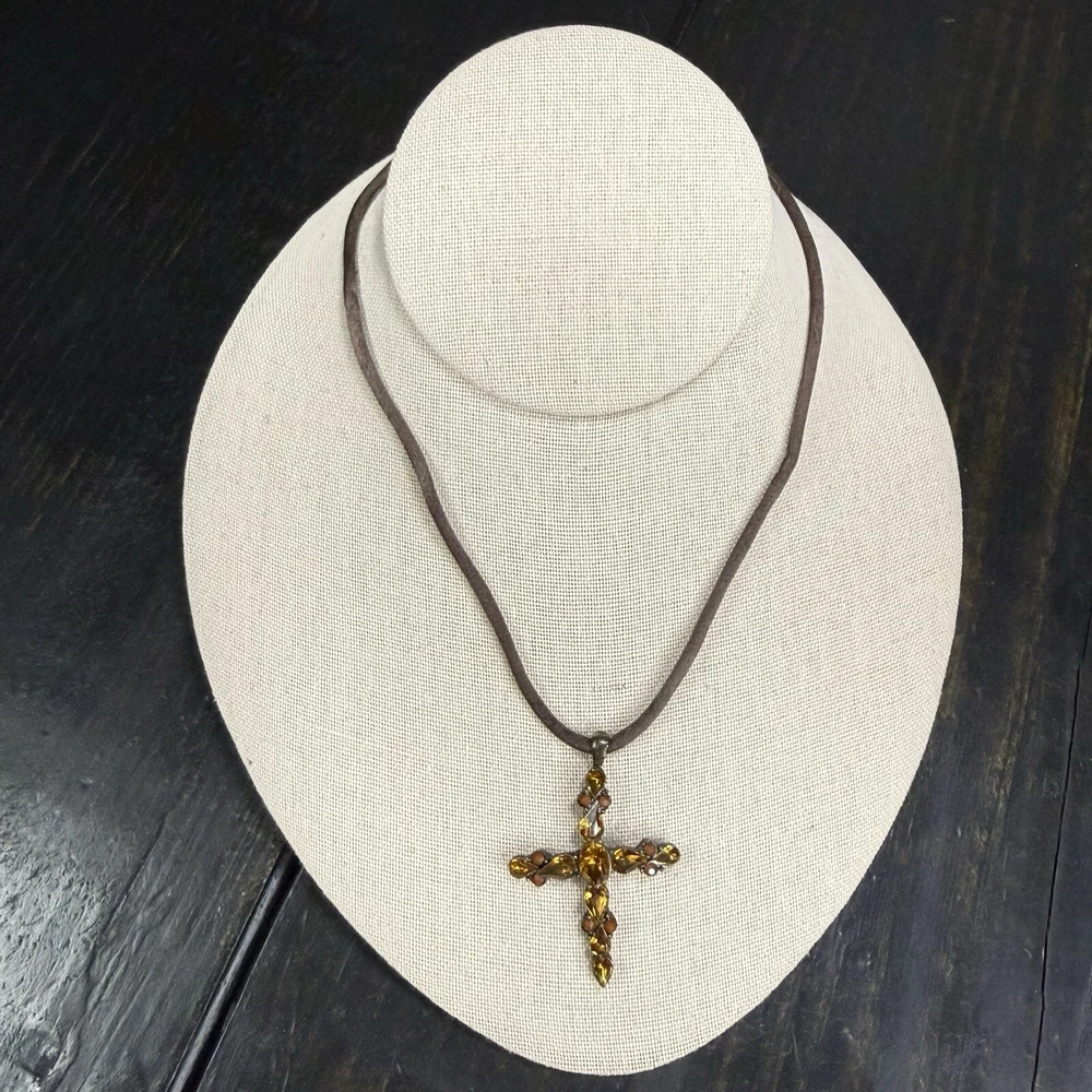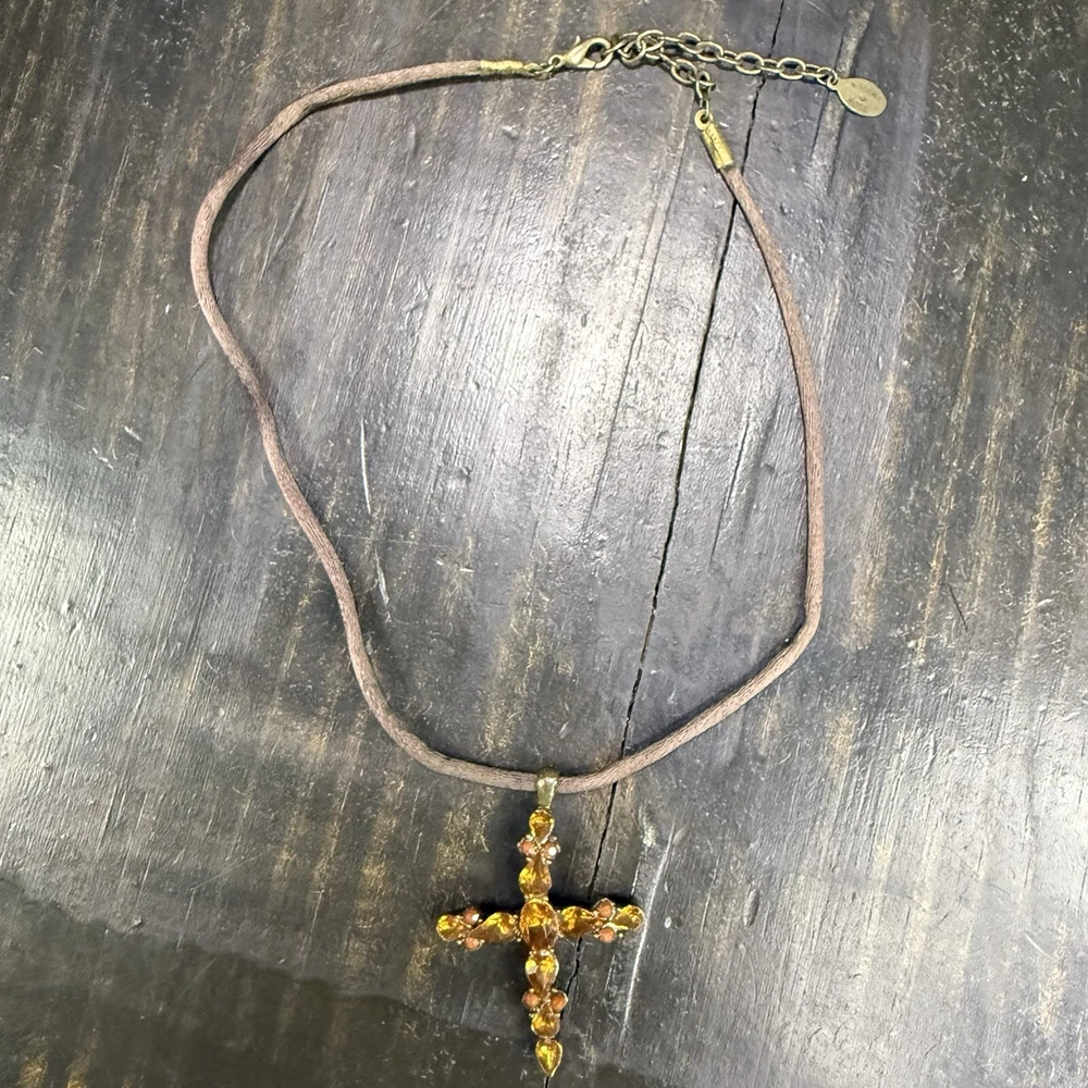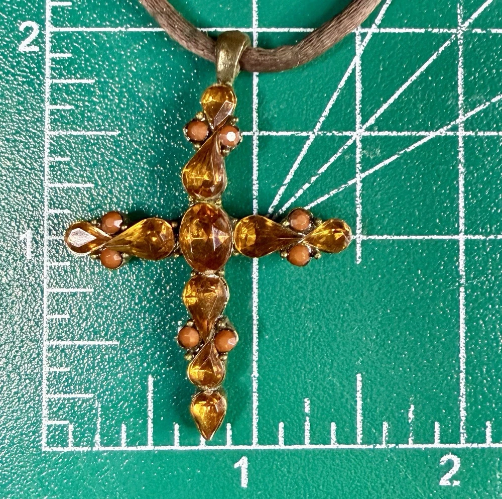 Robert Rose Amber Citrine Synthetic Stone Cross Pendant Fabric Cord Necklace 14”-16” Pre-owned. Very good condition. Photos are part of the description. If you purchase more than one fashion jewelry from my shop please message me so I can adjust the shipping fee. Thanks!