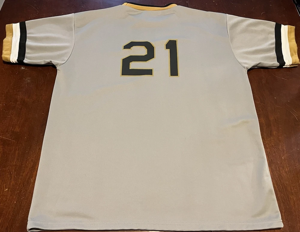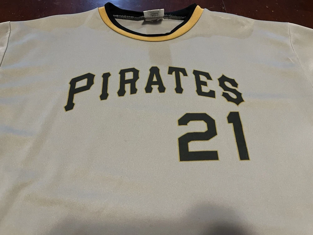 Show your love for baseball and the Pittsburgh Pirates with this Roberto Clemente #21 tee shirt jersey. Made by Associated Premium, this high-quality shirt is a must-have for any fan of the legendary player. The shirt is available in size XL and is perfect for men who want to wear their favorite team's jersey with pride. This shirt is a great addition to any sports memorabilia collection and is perfect for wearing to games or as a part of your everyday wardrobe. The shirt is made in Jersey and is part of the Major League (MLB) league. Get your hands on this shirt now and show your support for the Pittsburgh Pirates and Roberto Clemente.