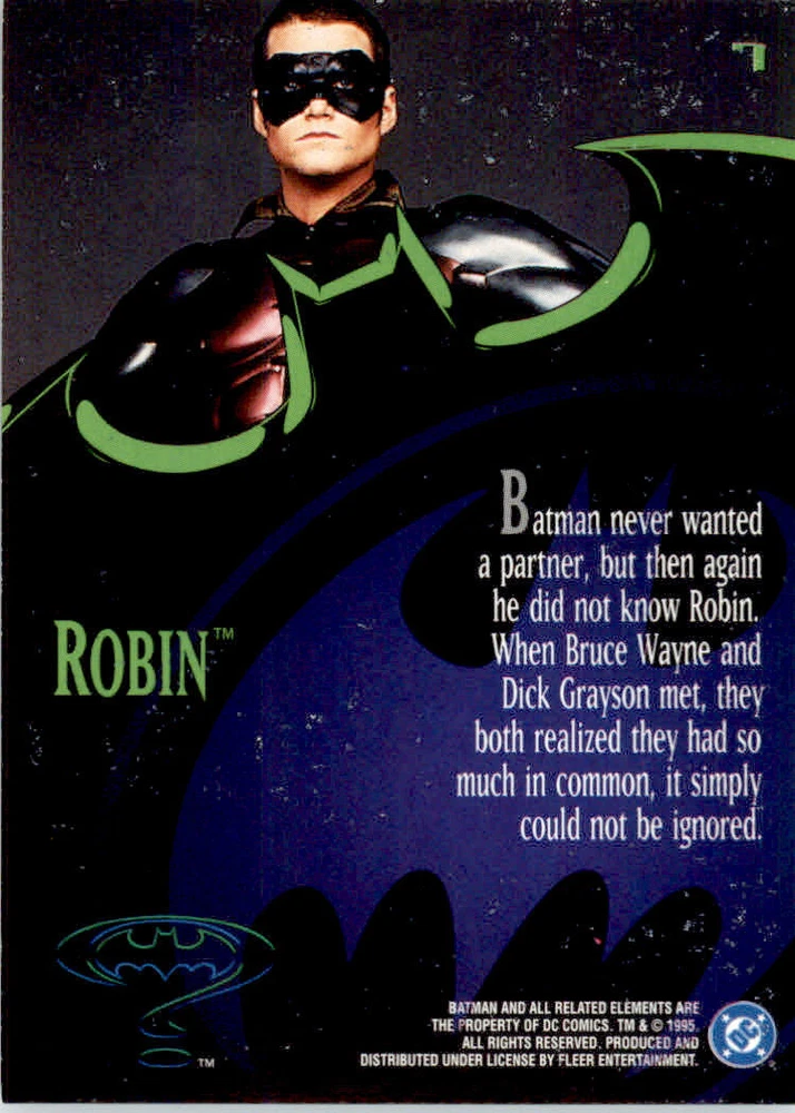 Franchise: NON_SPORT Player/Athlete: Robin Set: 1995 Ultra Batman Forever Graded: No Autographed: No Type: Non-Sport Trading Card Card Number: 7 Year Manufactured: 1995 Season: 1995