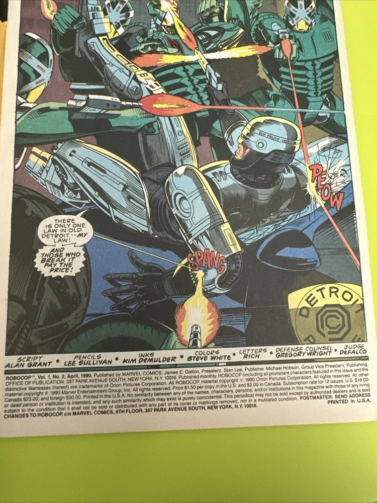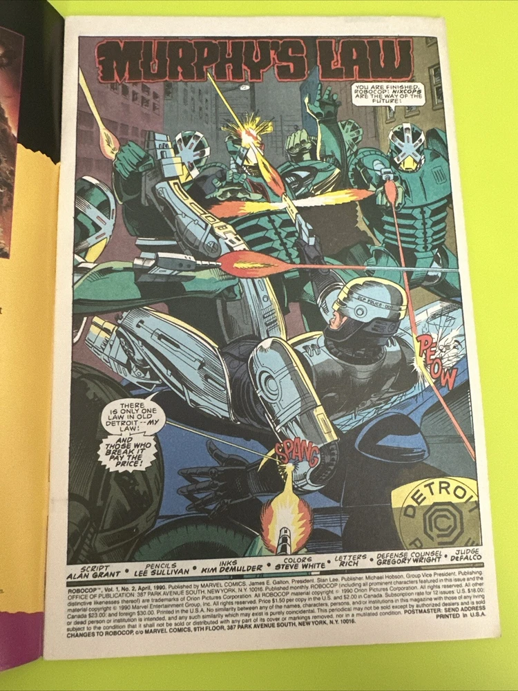 Artist/Writer: Alan Grant Type: Comic Book Intended Audience: General Audience Vintage: Yes Tradition: US Comics Unit of Sale: Single Unit Universe: Marvel (MCU) Issue Number: 2 Genre: Movie Adaptation, Science Fiction, Superheroes Country/Region of Manufacture: United States Superhero Team: Alpha Flight, Avengers, Fantastic Four Personalized: No Language: English Publication Year: 1990 Era: Copper Age (1984-1991) Series Title: RoboCop Style: Color Signed: No Cover Artist: Butch Guice, Jim Lee, Various Grade: 7.5 Very Fine- Character: RoboCop Inscribed: No Format: Single Issue Publisher: Marvel Comics