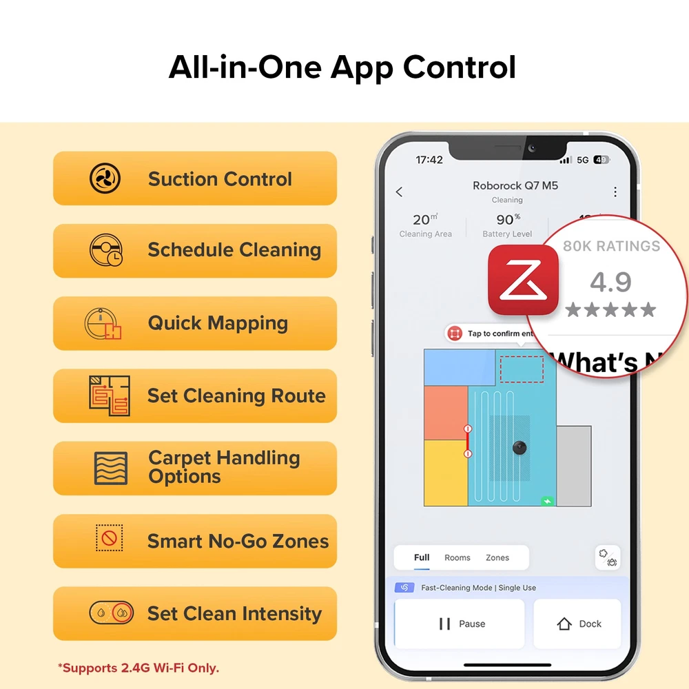 Dual Anti-Tangle Design Featuring a JawScrapers ™ Comb anti-tangle main brush aand an anti-tangle side brush, this advanced system ensures smoother cleaning performance with less maintenance. *Based on testing carried out by TÜV Rheinland. For anti-hair entanglement in different modes, the certification no. is CN25I41V 001. The pet hair tangle rate is 0%, while short human hair tangle rate is 0.063%. Actual results may vary depending on usage conditions. PreciSense ® LiDAR Navigation The LiDAR navigation system scans 360° and creates detailed maps for efficient route planning, while storing maps for multiple floors. Quick Mapping The Q7 M5 can create a map up to 6 times faster beforethe first cleaning task and can clean your daily area 30% faster when needed Mapping for large homes is faster than ever with a dedicated Quick Mappping function. Multi-Level Mapping Perfect for homes with more than one floor, the multi-level mapping system automatically recognizes different levels-just place the rolbot down, and it does the rest. No extra docks, no manual level selection inthe app. Smart Suggestions for No-Go Zones Smart navigation detects tight spaces like under chairs and tables and automatically suggests No-Go Zones for smooth, interruption-free cleaning. Carpet Avoidance After the mop cloth mount is installed, the robot avoids carpets and crosses them only when necessary to avoid missing any spots. App Control Access features easily using the handy Roborock App. * App connection requires 2.4GHz Wi-Fi. Temporary Cleaning During cleaning, if any area is not properly cleaned, you can direct the robot to clean it again. Once finished, it will resume its original task. High-Intensity Mopping In DEEP mopping mode, movements slow down, and mopping paths are finely divided for a deep, thorough clean, helping to tackle stubborn dirt with enhanced slow-mop action. Cleans Along Floor Direction Cleans along the direction of preset tiles for improved hair and dust removal from crevices while reducing noise from the main brush rubbing against floor cracks. Auto Boost on Carpet Automatically detects (or set in the app) carpeted areas and increases suction power for deeper cleaning and more effective dirt removal, ensuring a fresher, cleaner home. Schedule Cleaning With scheduled cleaning, set your robot to clean at specific times, keeping your floors spotless effortlessly. Whether daily, weekly, or as needed, enjoy a hands-free cleaning experience. Pet-Friendly Cleaning Effortlessly remove pet hair while keeping a low-noise and peaceful operation. Voice Control - Speak to Command Compatible with Amazon Alexa and Google Home for hands-free control. Child Lock Prevents accidental operation by children, ensuring safeand worry-free use. Easily enable or disable this feature through the Roborock app. Off-Peak Charging Supported Empower your wallet and the planet by scheduling charging for off-peak times, saving on energy costs, and contributing to a greener planet. What's In The Box: 1x Robot Vacuum 1x Charging Dock 1x Mop Module 1x Moisture-Proof Mat 1x Power Cable 1x User Manual Returns / Warranty Shipping Payment Contact us About Roborock Returns / Warranty Returns We accept returns within 30 days of purchase. Return your undamaged Roborock product to us to receive a full refund. Note: Before open a return request, please get in touch with us to help with any problems you are experiencing. We are here to assist. Warrant y (US Only) We have partnered with eBay to offer all eBay customers a special 2 Year warranty on any Roborock Certified Refurbished vacuum. Our 2 year warranty that is covered by Allstate. Comprehensive warranty from Allstate,US Only. Friendly reminder: Warranty service only applies to the United States, other regions are not covered by the warranty. Shipping 1. All products will be checked carefully and packed in good condition before shipping. 2. Will usually ship within 1-2 business days of receiving cleared payment. Shipping is standard shipping by FedEx, UPS, or USPS. A tracking number will be provided. 3. Before buying, make sure your order address is correct. If you find the address is incorrect and hope to send it to another address, send us a message before the item is dispatched. 4. If there is any shipping problem, please feel free to contact us, we will track the shipment and get back to you as soon as possible. Customer satisfaction is always what we are striving for. Payment 1.We accept all major credit cards and payments through eBay/Paypal. 2.Custom duties, taxes, or charges are not included in the cost you pay to us. 3.Please check with your country's customs office to determine what these additional costs will be prior to bidding or buying. Contact us 1.We guarantee that all items are as stated in the description. We strive for 100% customer satisfaction on each sale. 2.Our products come directly from our factory. There is no middle man, no high markup. So we provide quality items yet competitive price. 3.If you have any questions, please contact us before any dispute or negative feedback. We usually respond within 1 business day. 4.We will highly appreciate your positive feedback with all 5 stars. About Roborock Roborock is committed to innovation in researching, developing, and producing home cleaning devices, particularly robotic, cordless, and wet/ dry vacuum cleaners. Every Roborock product has been designed with an eye on solving genuine problems, so Roborock customers can live better lives. Currently, Roborock is available in more than 40 countries, including the U.S., Germany, France, and Spain. The company operates out of four locations, with offices in Beijing, Shanghai, Shenzhen, and Hong Kong.