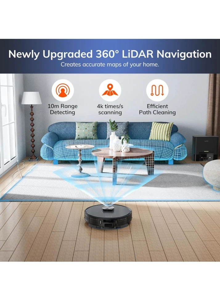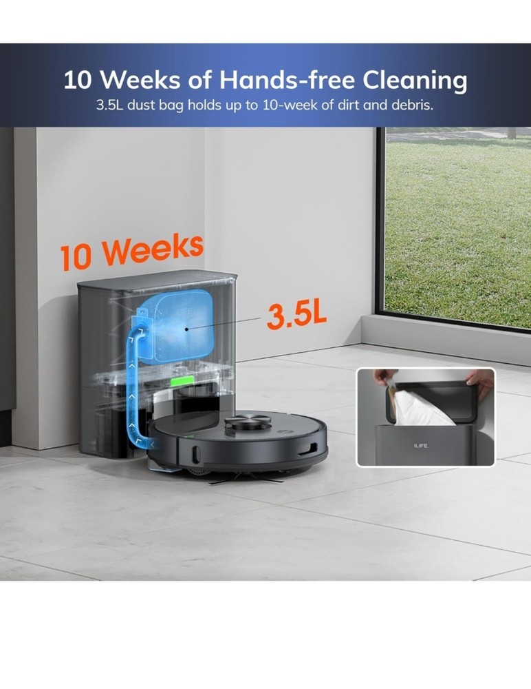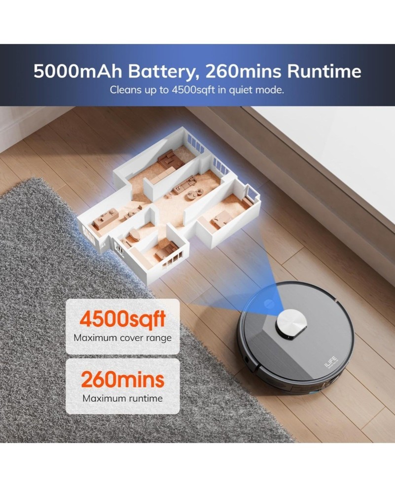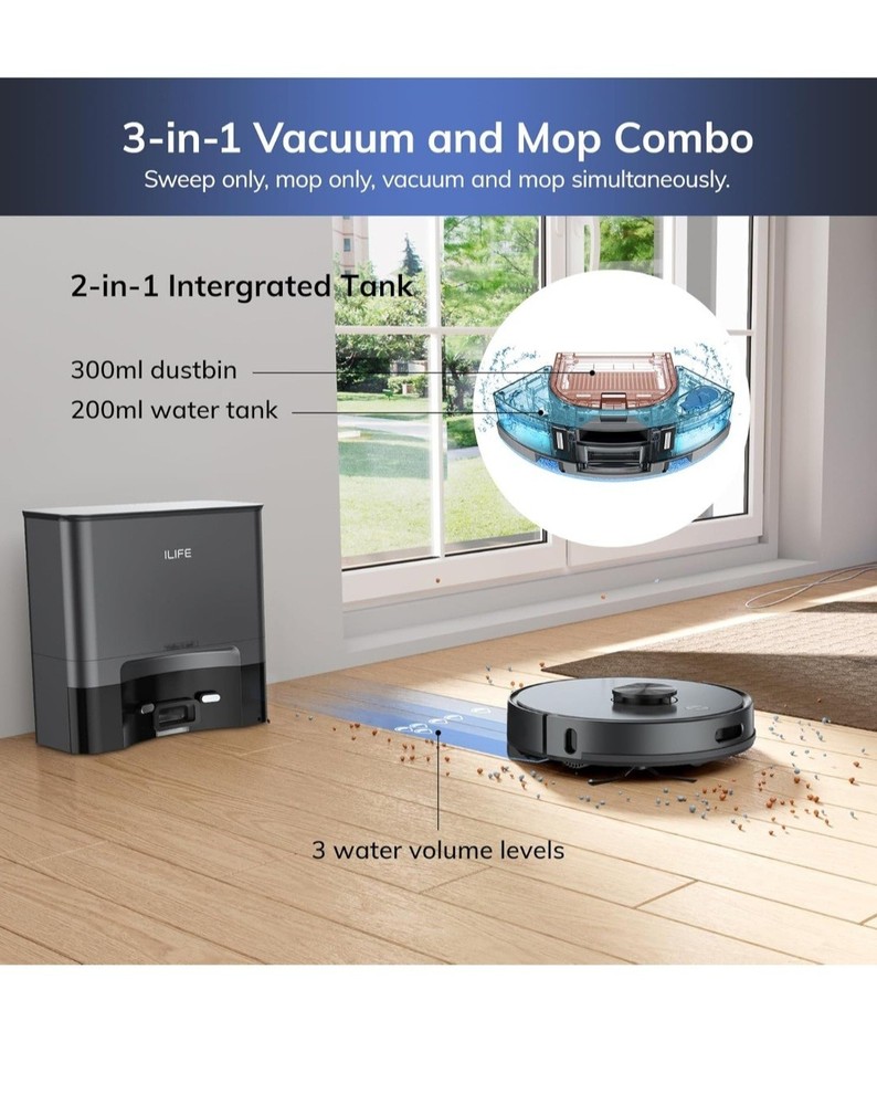 ILIFE T20s Self-Emptying Robot Vacuum and Mop Combo, 5000Pa Suction, 70-Day Capacity, LiDAR Navigation, 260mins Runtime, App/Alexa Control, Robotic Vacuum Cleaner for Hard Floors, Carpets and Pet Hair The Robot Vacuum Cleaner T20s is a high-tech smart vacuum cleaner that offers automated cleaning with its planned type cleaning route. With a power of 40W and a Li-ion battery, it provides up to 2 hours of battery life for efficient cleaning. This bagless vacuum cleaner with a 0.3L capacity is designed for both wet and dry sweeping, making it ideal for households with diverse cleaning needs. Its sleek black design, portable features, and battery-operated functionality make it a convenient and effective choice for keeping your home clean with ease.