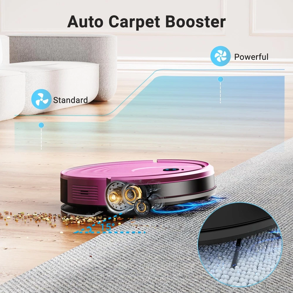 【5000Pa Super Suction Power, No Clogging Troubles】2025 robot vacuum cleaner is equipped with the latest brushless motors and high sensitivity sensors, with a speed of up to 26,500 RPM, 5000Pa strong suction power to effectively clean the floor of garbage and dust. Unique air inlet design won't get clogged by pet hair like other robot vacuum cleaners with roller brush, ideal for pet families. 【650ML Super Capacity, 2-in-1 Mopping Robot Vacuum Cleaner】Not only can you vacuum quickly, but also can mop the floor. The 300ML electronically controlled water tank and 350ML dust bin with large capacity efficiently clean the whole family, you don't need to clean the dust bin frequently. With wet mopping function, it penetrates evenly and is suitable for all hard floors such as laminate, tile, granite, parquet and so on. Leaves floors looking new and polished. 【Smart APP and Remote Control】With the Smartlife smart app, you can easily create a home cleaning program, change the cleaning mode and control the cleaning direction. Even if you are not at home, the sweeper will follow the program to clean the whole family. If you are at home, you can also directly use the remote control to make the sweeper perform different cleaning modes. 【130 Minutes Running Time and Self-Charging】Both mopping and vacuuming provide 3-speed intensity adjustment and the maximum running time is up to 130 minutes. The gears can be adjusted according to different floor types and cleaning needs, thus improving cleaning efficiency. The robot will automatically return to the charging base to recharge when the power is low or when cleaning is finished. 【Multiple Efficient Cleaning Modes】The robot vacuuming and mopping combination can flexibly switch between different modes (auto/spot/edge sweeping) via remote control or APP to meet the different cleaning needs of the family, and increase the efficiency by 30%. 2.87'' ultra-thin design helps the robot vacuum cleaner reach every corner or narrow space of the house to clean the residual dirty areas and keep the house neat and tidy. 【Smart Obstacle Avoidance and Sensing System】The robot vacuum cleaner has advanced 3D precise obstacle avoidance function, a full set of sensors can intelligently recognize and avoid white walls, stairs and obstacles, and it will automatically steer when it encounters an obstacle. Able to sense trash within 2 meters and actively clean it, you never need to worry about trash on your floor again. 【Automatic Mop Lift】Featuring a 20mm automatic mop lift, it can easily switch between vacuuming carpets and mopping floors. When the mop returns to the base, the mop also lifts automatically, ensuring a thorough cleaning in one go without leaving dirty streaks on the floor. 【Warm Service】's dedicated team is always ready to assist you with any product maintenance needs. Reach out to us anytime, and we'll promptly provide you with effective solutions to any issues you encounter. Hope you enjoy the cleaning experience of our robot vacuum cleaners. 【𝟓𝟎𝟎𝟎𝐏𝐚 𝐒𝐮𝐩𝐞𝐫 𝐒𝐮𝐜𝐭𝐢𝐨𝐧 𝐏𝐨𝐰𝐞𝐫, 𝐍𝐨 𝐂𝐥𝐨𝐠𝐠𝐢𝐧𝐠 𝐓𝐫𝐨𝐮𝐛𝐥𝐞𝐬】2025 robot vacuum and mop is equipped with the latest brushless motors and high sensitivity sensors, with a speed of up to 26,500 RPM, 5000Pa strong suction power to effectively clean the floor of garbage and dust. Unique air inlet design won't get clogged by pet hair like other robot vacuum cleaners with roller brush, ideal for pet families. 【𝟔𝟓𝟎𝐌𝐋 𝐒𝐮𝐩𝐞𝐫 𝐂𝐚𝐩𝐚𝐜𝐢𝐭𝐲, 𝟐-𝐢𝐧-𝟏 𝐕𝐚𝐜𝐮𝐮𝐦 𝐌𝐨𝐩 𝐑𝐨𝐛𝐨𝐭】Not only can you vacuum quickly, but also can mop the floor. The 300ML electronically controlled water tank and 350ML dust bin with large capacity efficiently clean the whole family, you don't need to clean the dust bin frequently. With wet mopping function, it penetrates evenly and is suitable for all hard floors such as laminate, tile, granite, parquet and so on. Leaves floors looking new and polished. 【𝐒𝐦𝐚𝐫𝐭 𝐀𝐏𝐏 𝐚𝐧𝐝 𝐑𝐞𝐦𝐨𝐭𝐞 𝐂𝐨𝐧𝐭𝐫𝐨𝐥】With the Smartlife smart app, you can easily create a home cleaning program, change the cleaning mode and control the cleaning direction. Even if you are not at home, the sweeper will follow the program to clean the whole family. If you are at home, you can also directly use the remote control to make the sweeper perform different cleaning modes. 【𝟏𝟑𝟎 𝐌𝐢𝐧𝐮𝐭𝐞𝐬 𝐑𝐮𝐧𝐧𝐢𝐧𝐠 𝐓𝐢𝐦𝐞 𝐚𝐧𝐝 𝐒𝐞𝐥𝐟-𝐂𝐡𝐚𝐫𝐠𝐢𝐧𝐠】Both mopping and vacuuming provide 3-speed intensity adjustment and the maximum running time is up to 130 minutes. The gears can be adjusted according to different floor types and cleaning needs, thus improving cleaning efficiency. The vacuum robots for home will automatically return to the charging base to recharge when the power is low or when cleaning is finished. 【𝐌𝐮𝐥𝐭𝐢𝐩𝐥𝐞 𝐄𝐟𝐟𝐢𝐜𝐢𝐞𝐧𝐭 𝐂𝐥𝐞𝐚𝐧𝐢𝐧𝐠 𝐌𝐨𝐝𝐞𝐬】The robot vacuuming and mopping combination can flexibly switch between different modes (auto/spot/edge sweeping) via remote control or APP to meet the different cleaning needs of the family, and increase the efficiency by 30%.2.87'' ultra-thin design helps the automatic vacuum robot reach every corner or narrow space of the house to clean the residual dirty areas and keep the house neat and tidy. 【𝐒𝐦𝐚𝐫𝐭 𝐎𝐛𝐬𝐭𝐚𝐜𝐥𝐞 𝐀𝐯𝐨𝐢𝐝𝐚𝐧𝐜𝐞 𝐚𝐧𝐝 𝐒𝐞𝐧𝐬𝐢𝐧𝐠 𝐒𝐲𝐬𝐭𝐞𝐦】The smart vacuum robot has advanced 3D precise obstacle avoidance function, a full set of sensors can intelligently recognize and avoid white walls, stairs and obstacles, and it will