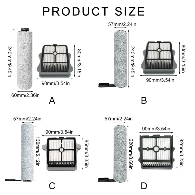 Features: Enhancing your cleaning efficiency with our replacement brush rollers and filter, specifically designed for wireless wet dry vacuum cleaners. Featuring washable and reusable component, these brush rollers and high efficiency filters ensure optimal performances and longevity of your vacuum cleaner. Suitable for homemakers, pet owners, and anyone who prioritizes maintaining a clean living environment, these replacement parts are perfect for enhancing your cleaning routine. Perfect for everyday household cleaning, especially in homes with pets or children, ensuring a healthier and more hygienic space. Crafted from fiber and ABS materials, this accessory set not only supports effective cleaning but also promotes sustainability, making it for conscientious consumers. Specifications: Texture: Fiber+ABS A Main Brush Size: Approx. 9.45x2.36x2.36inch(24x6x6cm) A Filter Size: Approx. 3.54x3.15x1.97inch(9x8x5cm) B Main Brush Size: Approx. 9.45x3.94x2.24inch(24x10x5.7cm) B Filter Size: Approx. 3.54x3.15x1.97inch(9x8x5cm) C Main Brush Size: Approx. 5.12x2.24x5inch(13x5.7x12.7cm) C Filter Size: Approx. 3.54x3.35x2.36inch(9x8.5x6cm) D Main Brush Size: Approx. 8.66x3.94x2.24inch(22x10x5.7cm) D Filter Size: Approx. 3.54x3.23x2.36inch(9x8.2x6cm) Package Includes: Set Brush and Filters note: Please allow 1-2cm errors due to manual measurement. Due to the differences between different monitors, the picture may not reflect the actual color from the item.