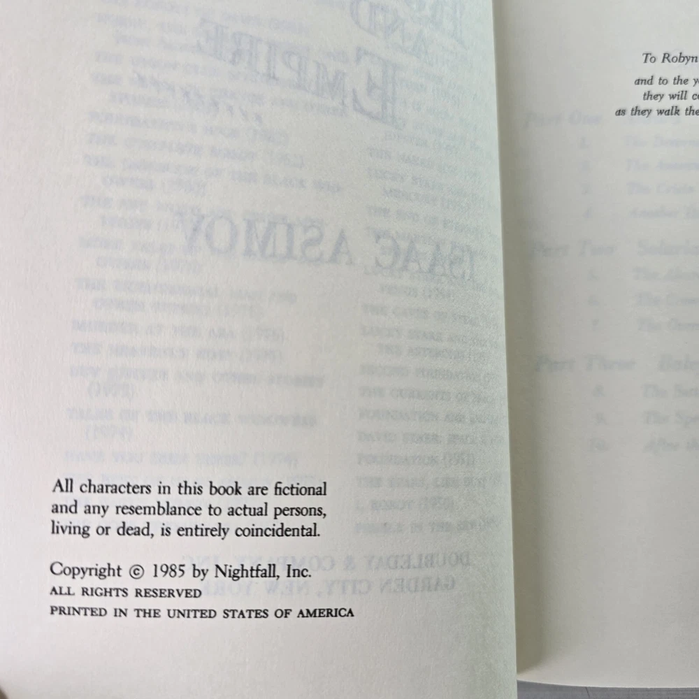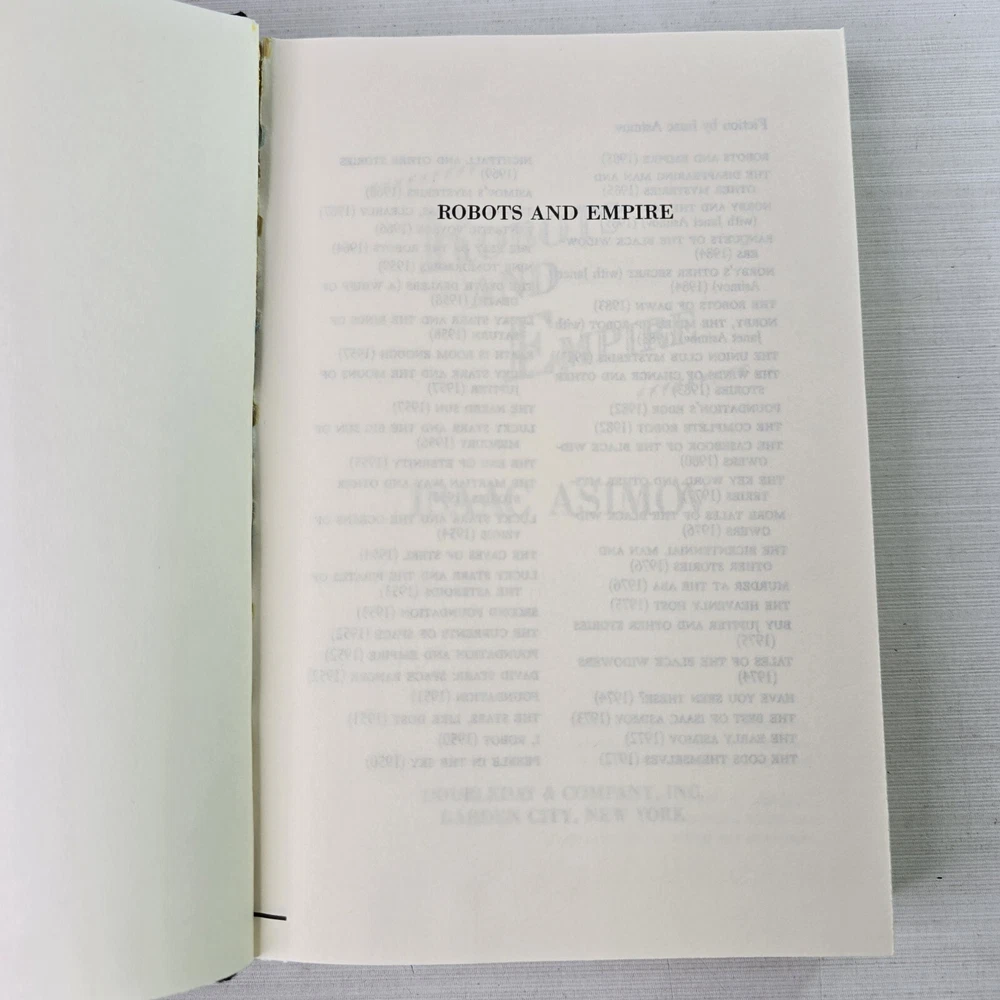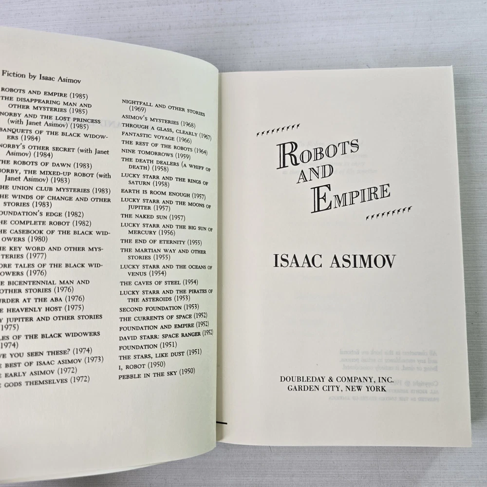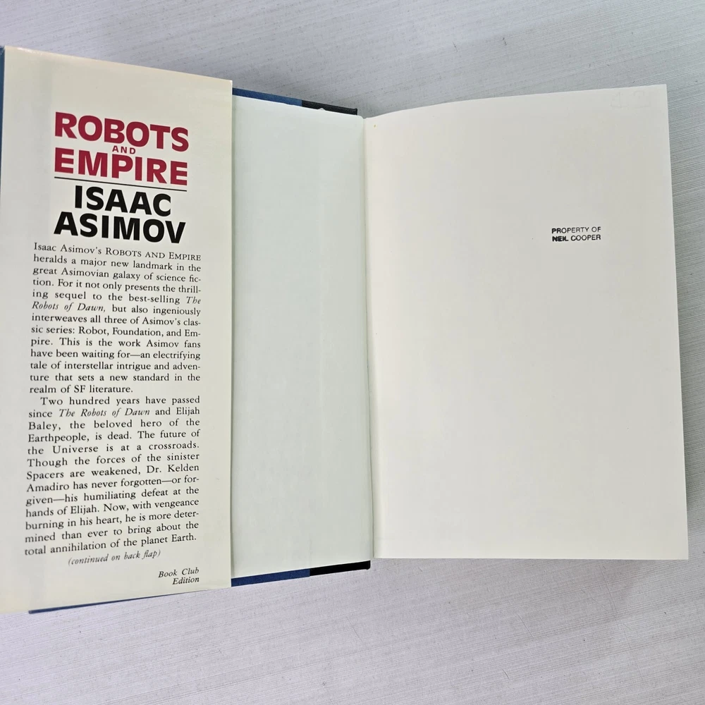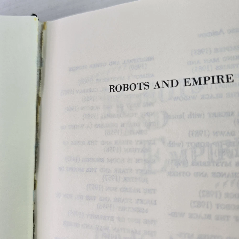 Robots And Empire by Isaac Asimov 1st Ed DJ/HC 1985 Science Fiction Fantasy Long after his humiliating defeat at the hands of Earthman Elijah Baley, Keldon Amadiro embarked on a plan to destroy planet Earth. But even after his death, Baley's vision continued to guide his robot partner, R. Daneel Olivaw, who had the wisdom of a great man behind him and an indestructable will to win.... A collector's books. They each have the name of the previous owner stamped &/or written on the face of the book and on the inside page/s. The photographs provided will give you the detail. The photographs are of the book/s listed and provide the detail. I post every day, Monday to Friday, excluding public holidays. Standard Parcel includes tracking and Express postage is available for an additional cost. Free Returns. International buyers to pay postage, any customs duties, and any return post.
