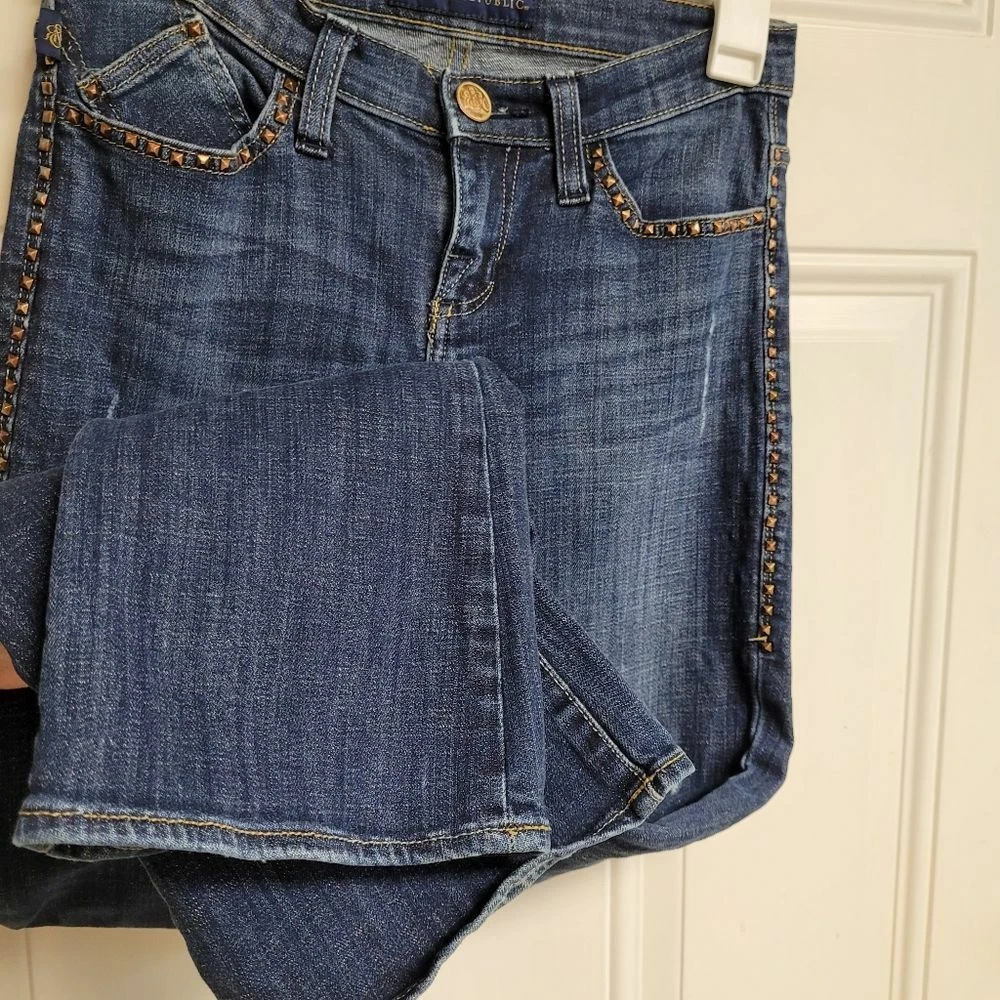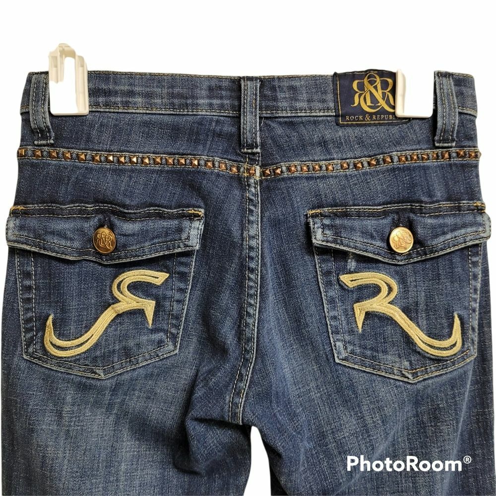 Rock and republic lightly distressed studded bootcut jeans. Buttoned flap pockets in back with gold embroidered pocket design Imperfection ( 1 small hole in the lower back leg pictured above) Size: 2