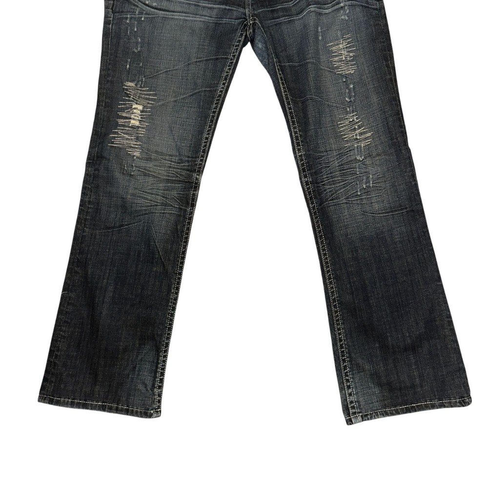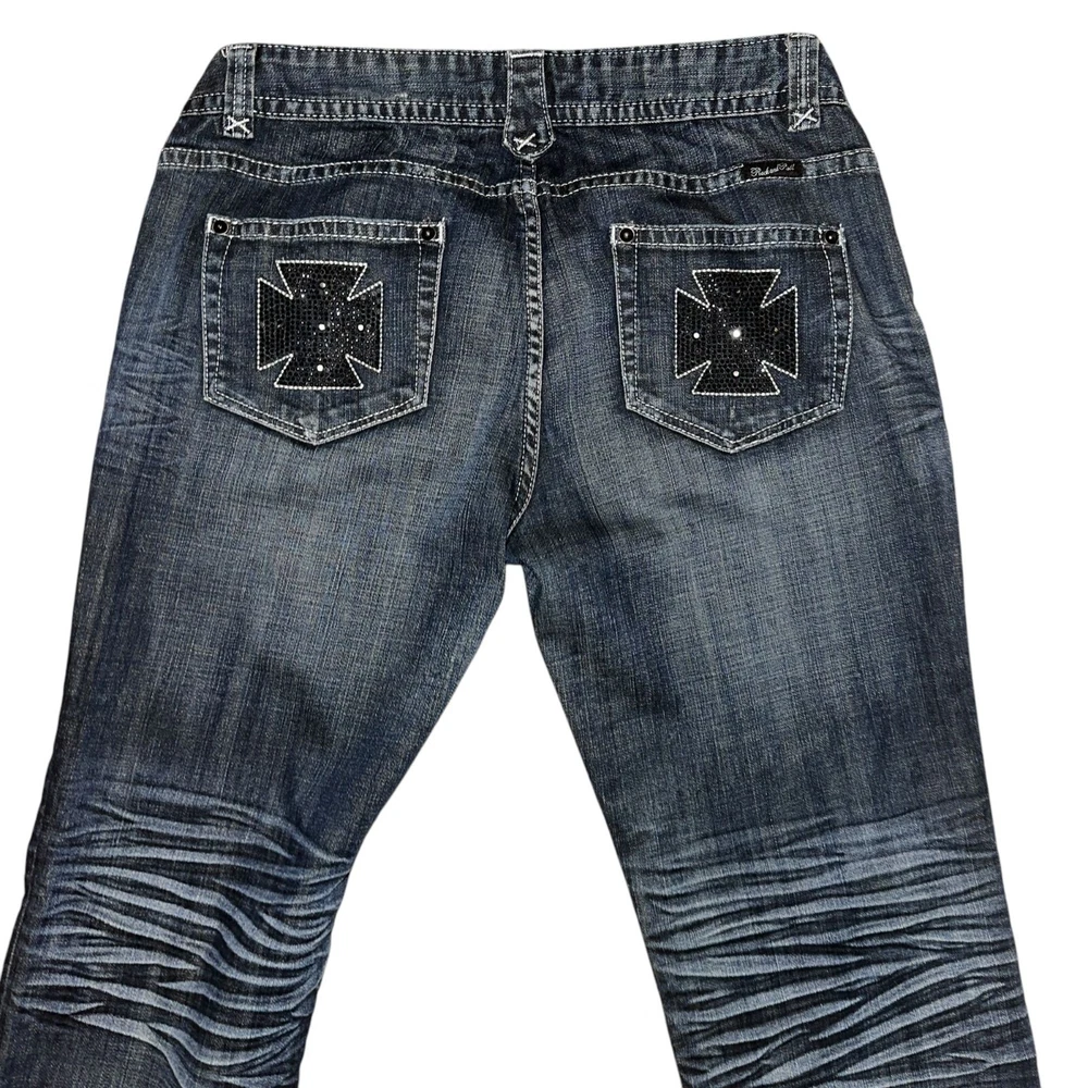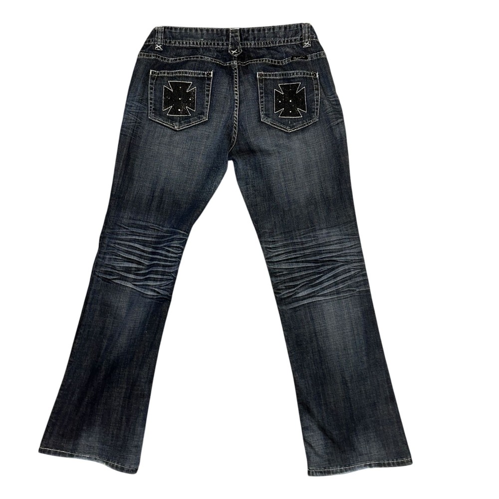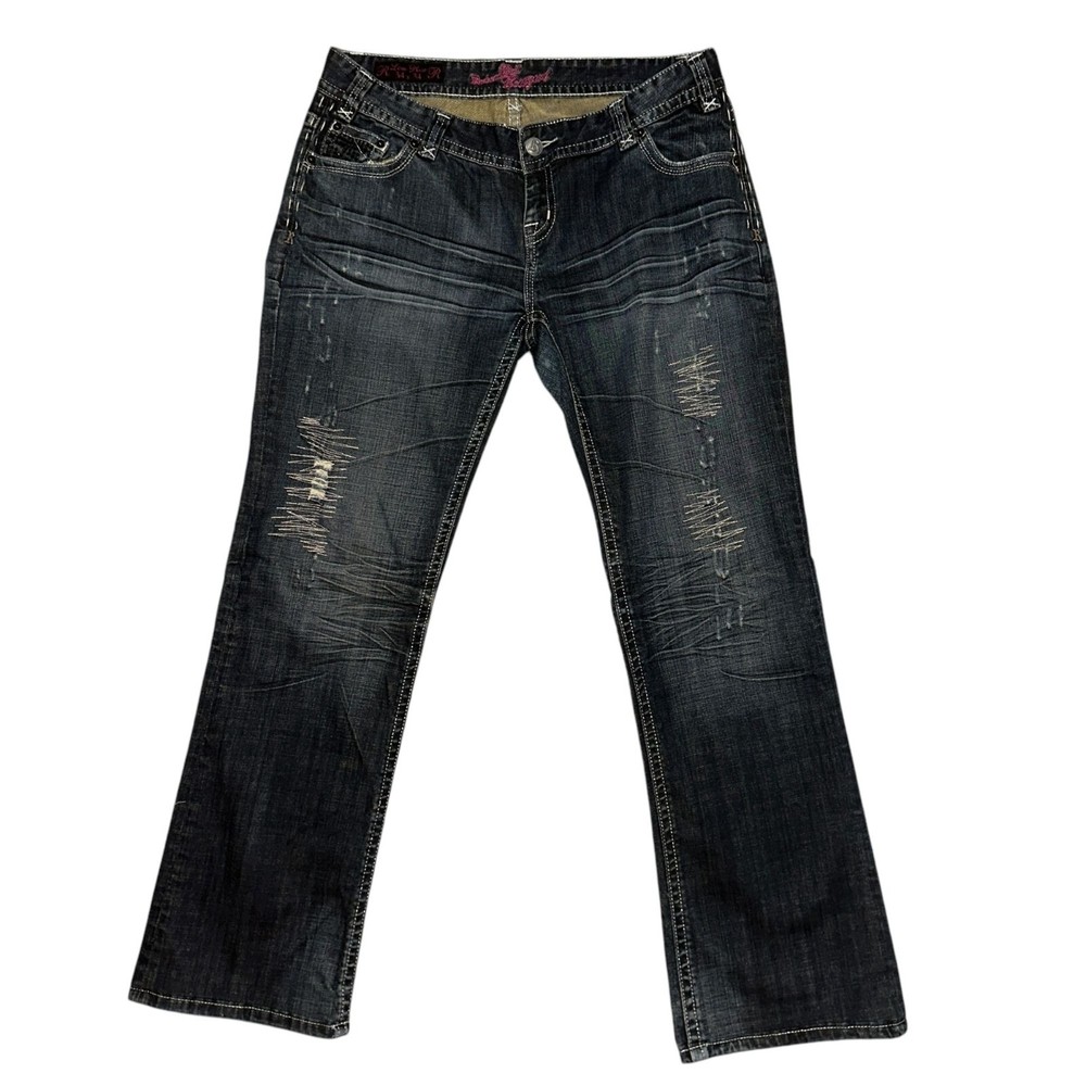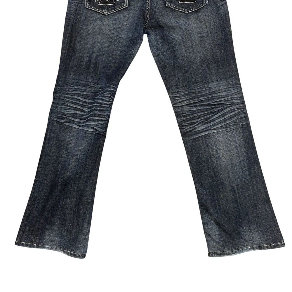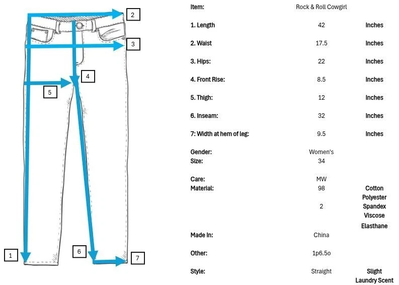 Features: • Brand: Rock and Roll Cowgirl • Type: Jeans, Bottoms • Style: Straight Leg • Front: Flat • Season: Spring, Summer, Fall, Winter • Pattern: Solid • Made in China • Care: Machine Wash • Rise: Low • Color: Blue, Black, Silver • Wash: Medium • Features: Embroidered, Studded, Rhinsetones, Distressed, Frayed, Stitched • Closure: Zipper Fly • Material: Denim, 98% Cotton, 2% Spandex, Lighterweight • Size: Women's Plus Size 34 • Condition: Good, Some fading & wear, Laundry scent • Other: Western, Cowboy, Cowgirl, Dance, Rodeo, Show Measurements are Approximate: Length: 42 in / 107 cm Waist: 17.5 in / 44 cm Hips: 22 in / 56 cm Front Rise: 8.5 in / 22 cm Thigh: 12 in / 30 cm Inseam: 32 in / 81 cm Width at hem of leg: 9.5 in / 24 cm Orders shipped within 1-2 business days. 0101087901
