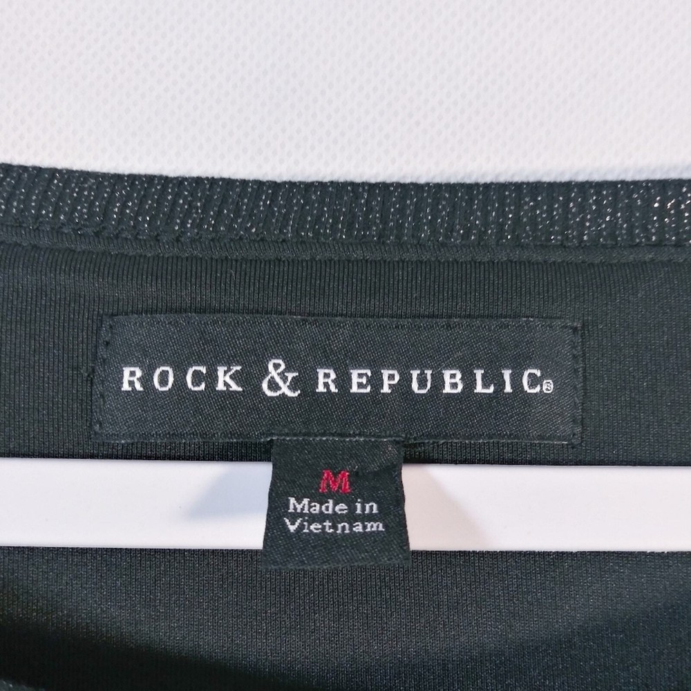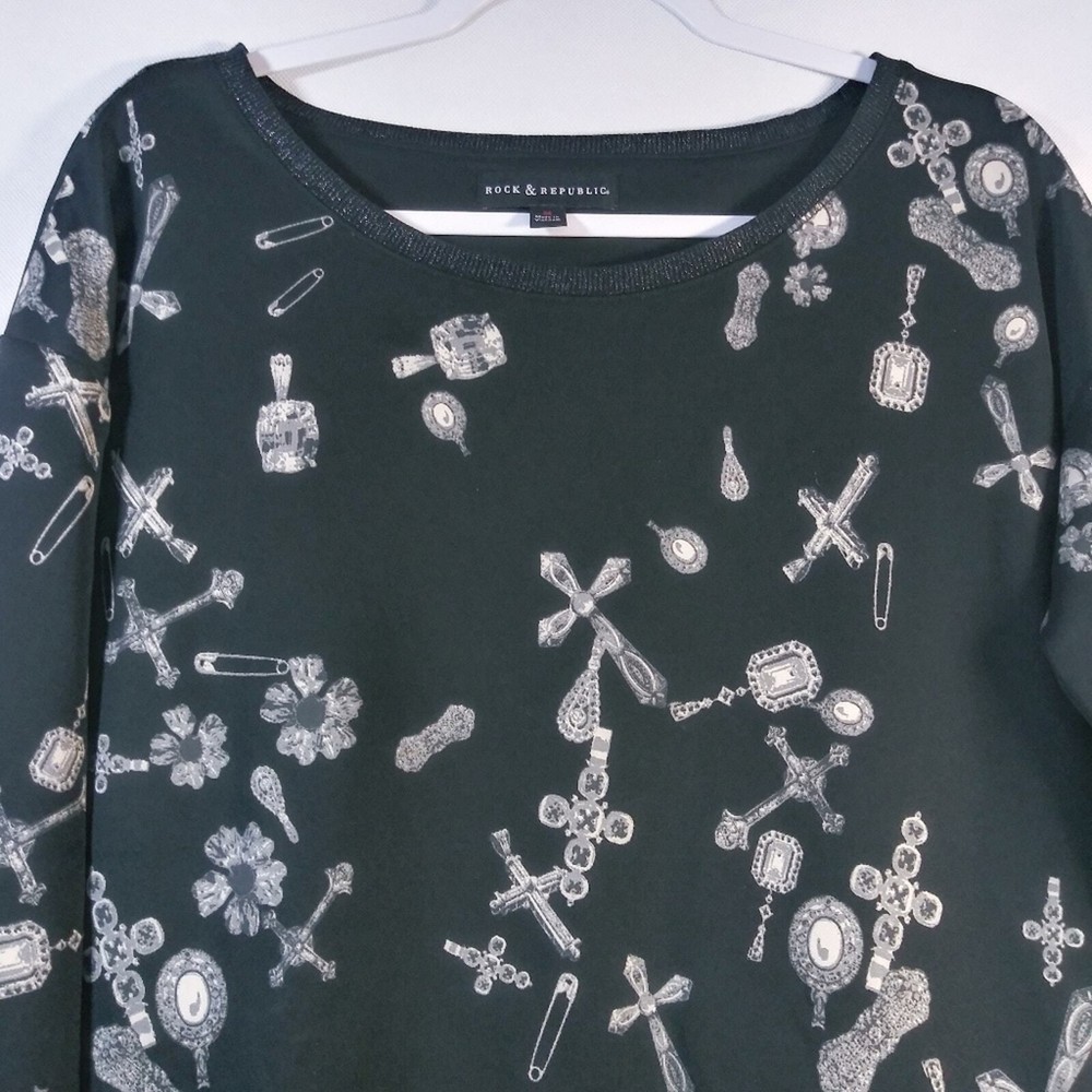 Rock & Republic Black Jewels and Crosses Patterned Gothic Grunge Sweatshirt Size M Long sleeve sweatshirt jewels and cross pattern throughout black glitter hem on cuffs and waist band boat neck soft and comfy over sized gently worn approximate measurements pit to pit 21" length 24"