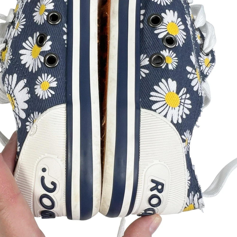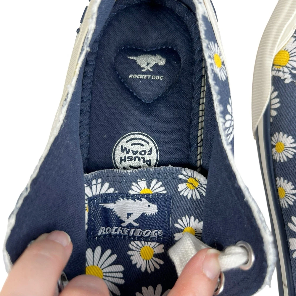 Rocket Dog Jazzin Navy Daisy Plush Foam Sneakers Shoes. Size 9. In gently preowned condition with some scuffing to the sides, wear to the soles and faint color transfer on the laces. Colorful daisy print with a navy blue background. Low top, lace up, cotton upper, rubber toe cap, Rocket Dog logo heel cap and plush foam comfort insole.