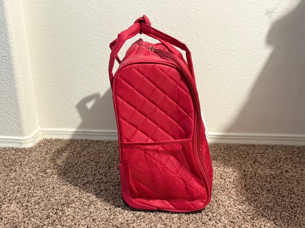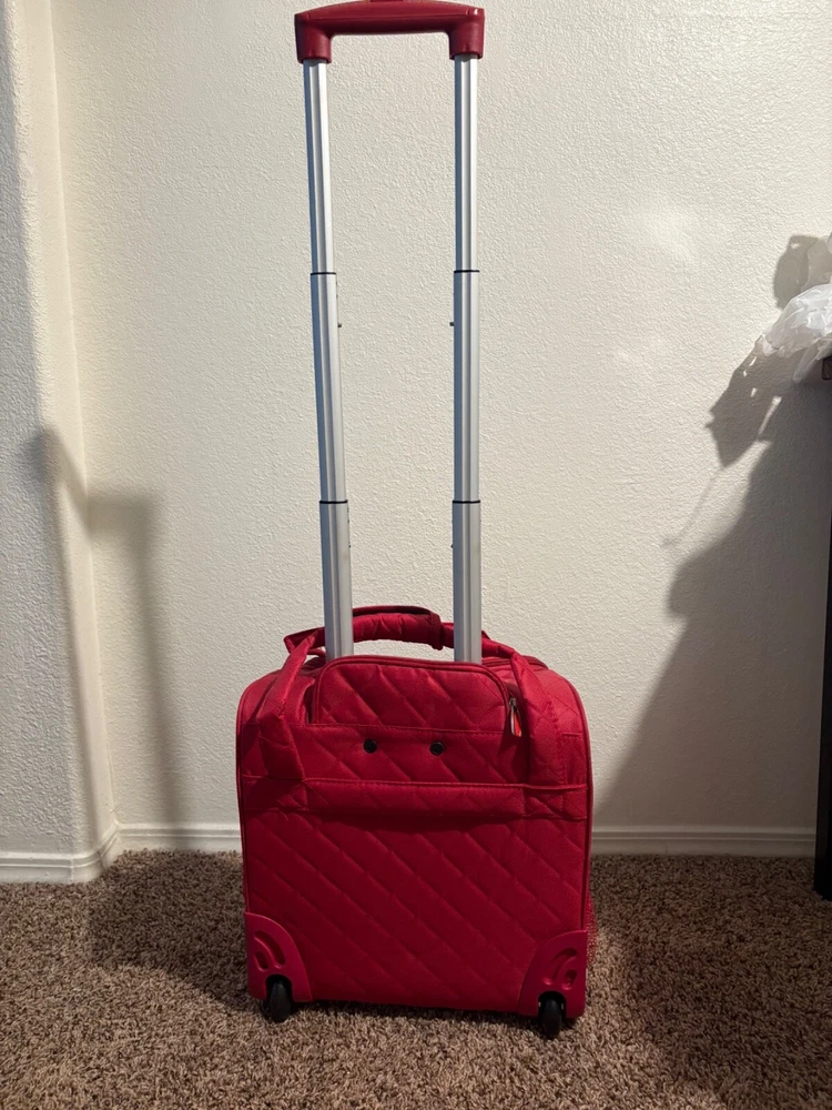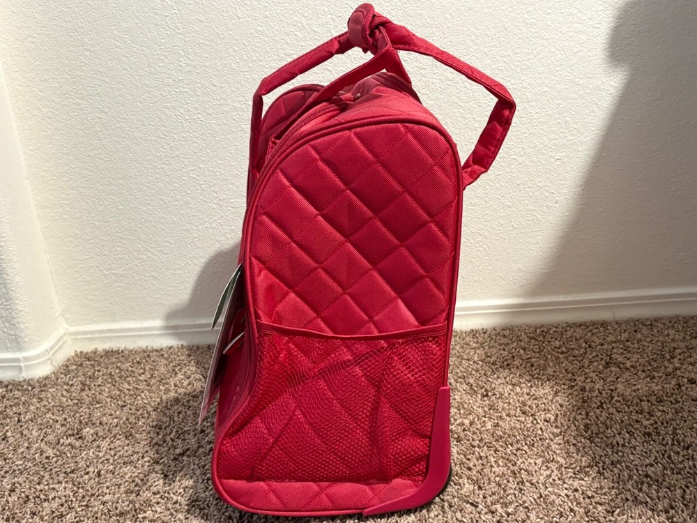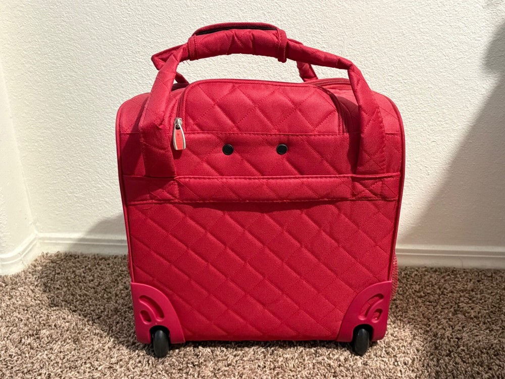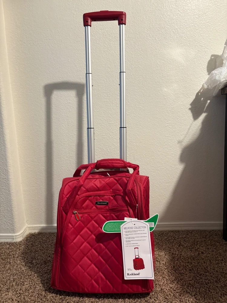 The Rockland Melrose Upright Wheeled Underseater Carry-On Luggage in Red is a compact 15-inch carry-on bag designed for convenient travel. It features a sturdy design, and has dimensions of 15x4x9 inches. Ideal for short trips or as an additional bag for your main luggage, this underseat luggage is perfect for storing essentials while on the go.
