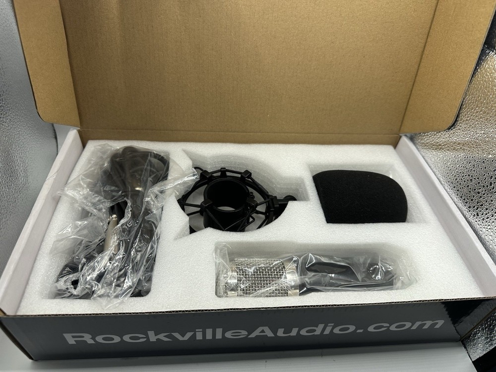 Open box to take pictures The Rockville RCM01 Pro Studio Recording Condenser Microphone is a high-quality audio recording device suitable for studio use. It features a cardioid polar pattern, extended frequency response, and noise cancellation capabilities. The microphone is compact and lightweight, making it easy to handle and maneuver. It also has a built-in windscreen, on/off switch, and an internal shock mount to prevent audio interference. In addition, the microphone is compatible with wired and XLR 3 pin connectivity, making it versatile and easy to use with different audio recording systems. The diaphragm size is large, and the transducer type is a condenser, ensuring optimal audio capture. The microphone is manufactured in China and comes with a 1-year manufacturer warranty.