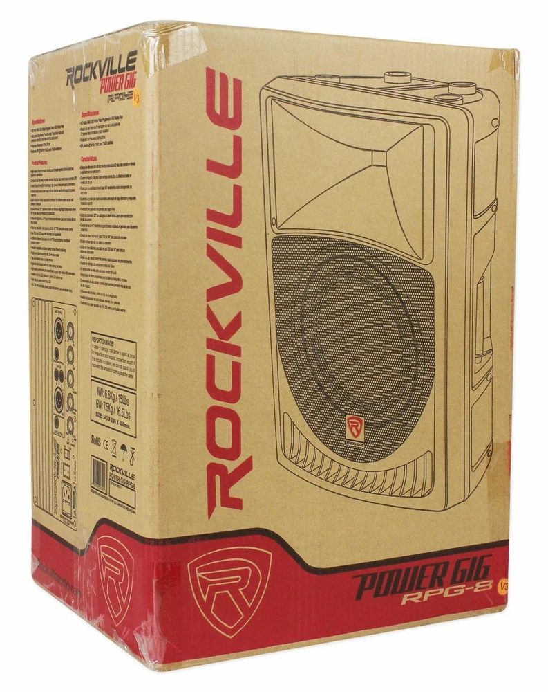 Car Audio & Video Pro Audio Marine Audio Lighting Karaoke Home/Portable Audio Rockville RPG8 400 Watt 2-Way DJ/PA Powered Speaker With an 8 Woofer and a 2 Voice Coil - Constructed With State-Of-The-Art Components For Incredible Sound and Deep Bass Click Thumbnails to Enlarge Condition and Warranty Condition: SLIGHTLY USED, TESTED TO BE IN PERFECT WORKING CONDITION, IN GREAT COSMETIC CONDITION, AND INCLUDES ORIGINAL BOX Warranty: 1 YEAR AUDIOSAVINGS Product Description The Rockville RPG8 powered PA speaker is simply amazing in terms of sound quality, and raw power! This speaker has an incredible 400 watts of peak power and will deliver a massive amount of bass, mids, and highs. The ultra-efficient design is amazing! This speaker is the result of a year of research and development. We tested samples of 5 top selling powered speakers and the RPG series out-performed them all. These go louder and have punchier bass. What we found to be interesting was that some of the other speakers we tested against these were rated by their manufacturers at 1,000 watts or more, but they only went around half as loud as these. The 8" woofer built into this speaker has a 2" aluminum voice coil which provides an extremely loud, deep, punchy bass response. Couple that with our state-of-the-art 1.35'' Japanese made pure titanium-diaphragm compression driver and the ultra-wide dispersion, 40° large-format horizontal wave guide horn and you get beautiful full range concert-quality sound. The linear class A/B amplifier built into these speakers is efficient and provides clean power to the speaker. Some of the competing speakers use cheap amps in their speakers. We really went out of our way to make sure the amp built into these speakers gives you enough power so you can really feel and taste the music. The amplifier also has a clipping LED and a limiter to ensure long life to the speaker. The built in 2 band EQ will allow you to fine-tune and tweak the sound to your liking. The RPG8 has a versatile trapezoidal enclosure design which allows you to use it as a PA speaker. It is also flyable and stand mountable giving you many options on how you can utilize these speakers. We also included all the inputs and outputs you would need along with great controls. These have XLR and 1/4" ultra-low noise Mic / Line inputs with volume control as well as line RCA and XLR inputs with separate Gain adjustments. There is also an additional balanced line output via XLR for linking of additional speakers. If you are in the market for a high quality 8" active speaker, then we highly recommend the RPG8. We feel this is the best value on the market. You get great features, great quality, high power, and a lot of versatility for a great price. Features: Rockville RPG8 8" Active/Powered 400 Watts DJ PA Speaker System 100-Watt RMS / 200 Watts Program Power / 400 Watts Peak High power long-throw 8'' woofer with 2" aluminum voice coil provides incredibly deep bass and acoustic power Frequency Response: 50Hz-20KHz Maximum SPL @1w/1m: 119dB peak / 116dB continuous High-power 2-way pro sound reinforcement speaker system for live sound and playback applications Compact and light weight system delivers distortion free sound even at extreme SPL Linear Class AB amplifier technology: high power, transparent sonic performance Internal switch-mode power supply for low distortion audio with superior transient response Built-in bass and treble equalization processor for ultimate system control and speaker protection State-of-the-art 1.35'' Japanese made pure titanium-diaphragm compression driver for crystal clear high-frequency reproduction Ultra-wide dispersion, 40° large-format horizontal wave guide horn molded directly into cabinet Ultra-low noise Mic / Line input via XLR & 1/4-inch stereo jacks with volume control Line RCA and XLR input with separate Gain adjustment Additional balanced line output via XLR for linking of additional speaker systems Versatile trapezoidal enclosure design allows different positioning Flyable and stand mounting with 35-mm pole socket Ergonomically shaped handle for easy carrying and setup High-quality components and exceptionally rugged high impact ABS construction Amplifier clip limit LED indicator & power LED cabinet rear Front display power meter Blue LED About Rockville Quality Control Procedures: The Rockville brand stands for Quality, Innovation and Value. All Rockville products go through the most rigorous quality control standards in the industry. Products go through months of extensive testing before they reach your hands. All user functions are tested and all internal components are tested for quality. Rockville makes products that are virtually un-breakable! Rockville is one of the only brands in its class to test every concept model for weeks or months before starting production. Once production begins, Rockville sends product engineers to their factory to quality control every line of production. During production every product is tested and on top of that Rockville goes the extra mile and has their high level product engineers do an additional quality control. They test a certain percentage of all products from the production line a second time to ensure that the quality meets their vigorous standards, and to make sure that there is never a batch of products with even a slight problem. All Rockville DJ/PA speakers are backed with a full 1 Year warranty, though it is unlikely that you will need to use it. Return Policy AudioSavings Return Policy: At Audiosavings, we strongly believe in customer satisfaction and therefore offer free return shipping within 30 days of purchase on all items returned to us within the continental USA. Prior to returning merchandise, contact us and we will give you a return authorization # and a return label. You may return this item for a refund within 30 DAYS of purchase. Warranty Repair/Exchange Period: 1 YEAR If your item is defective or you want to return it for any reason