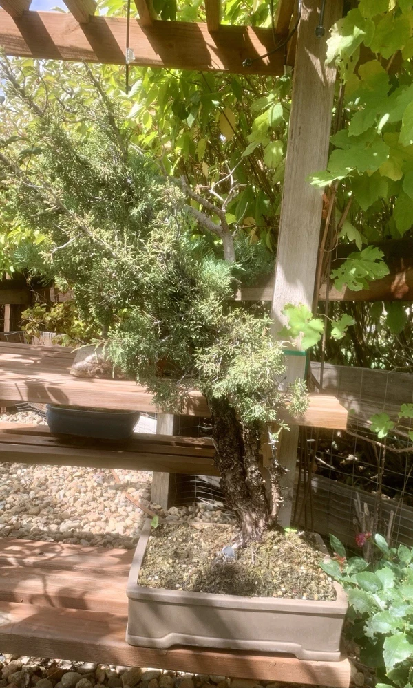Rocky Mountain Juniper Bonsai Nebari 3 inches Height 32 inches Out of collection 1 year+ Triple trunk, one of which is deadwood Chinese ceramic Buyer pays shipping of their choice Starting bid $200, BIN $400