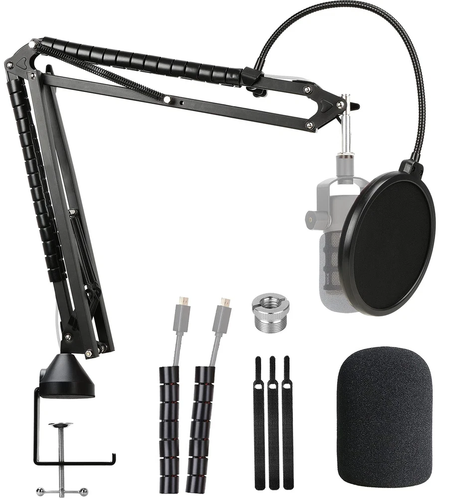 If you are looking for a professional, broadcast quality microphone boom like you might see in a radio station control room 's heavy duty suspension boom scissor arm stand is your best choice. Mic stand for Rode Podmic is built with firm metal, double-braced arms and strong spring and can be used for different conditions. Professional Mic Cover Protect your favorite mic: Protect your microphone from smell of drool, surplus spit, accumulation of saliva. Easy & quick mount / unmount: Screw rotating clamp with scratch-proof gripper and rubber mat offers you a friendly and easy mounting and demounting. This foam wind screen is maded of high-density foam which can protect your mic from dust damage. Picks your original sound only. Say goodbye to complicated post-production. Professinal Pop Filter: Banish the dreaded hissing and lisping sounds that come when pronouncing the letter "S" and blocks those ugly "plosives" that follows "B" and "P". It is a great item for singers, streamers and actors Cable Management Sleeve Cable Sleeve can organized your mic power cord, ensure the cord doesn't get tangled. Looks more beautiful and neat. Simply gather your cables with boom arm's pipe. Force open the end of the cable sleeve and lay your wires and pipe inside. The two cable steeve should be installed in the two positions of the mic stand. Hiding cables with these wraps has never been so easy, your cable mess is now organized. Package included: 1 x Microphone stand 1 x Pop filter for microphone rodepod mic 1 x Foam windscreen for microphone rodepod mic 1 x Mic stand adapter 1 x Upgraded Table Mounting Clamp 2 x Cable organizer 3 x Velcro cable [All-in-one Combo]: Package includes all the items for studio recording and live sound: 1 x heavy duty microphone stand, 1 x pop filter, 1 x windscreen, 2 x cable organizer, 3 x velcro cable ties for Rode Podmic microphone. [Mic Stand]: Bold-spring protects microphone from shaking, suddenly dropping and making noise. Suspension boom scissor arm can keep the microphone in any position you want. [Mic Cover]: Professional foam windscreen with double layered screen pop filters filter out all unwanted background noises. [Compatibility]: The reach on this mic boom is 27"/70cm from base to mount, max desktop thickness: 2.7"/7cm, max load:1.6kg. Convenient to use in any scene. [Excellent Details]: Microphone table clip with soft cushion protect your furniture, 3/8"-16 female to 5/8"-27 male screw thread adapter never worry about installation problems.