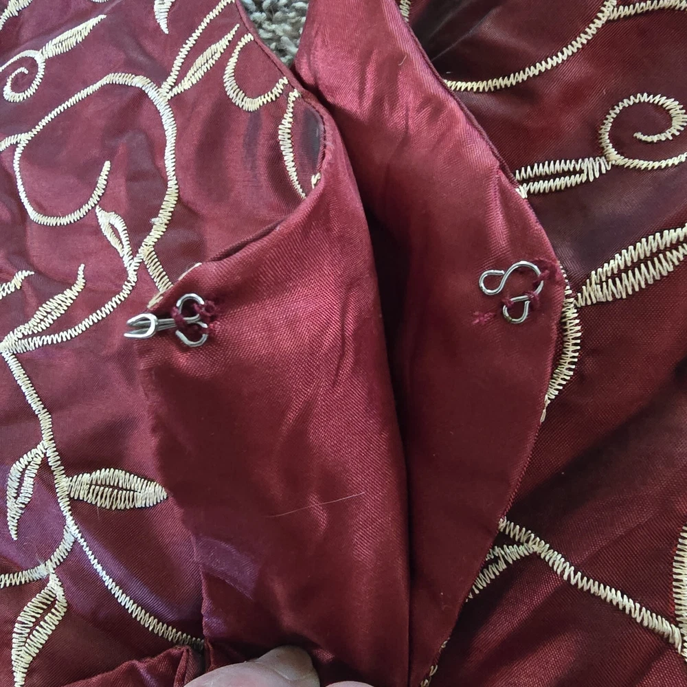 Rodeo Home Red W/ Gold Stitching Round Christmas Tree Skirt Holiday Decoration Eyelet Hooks A few small snags, good condition