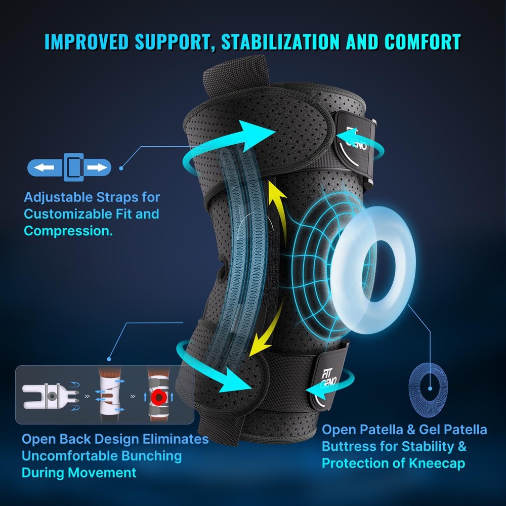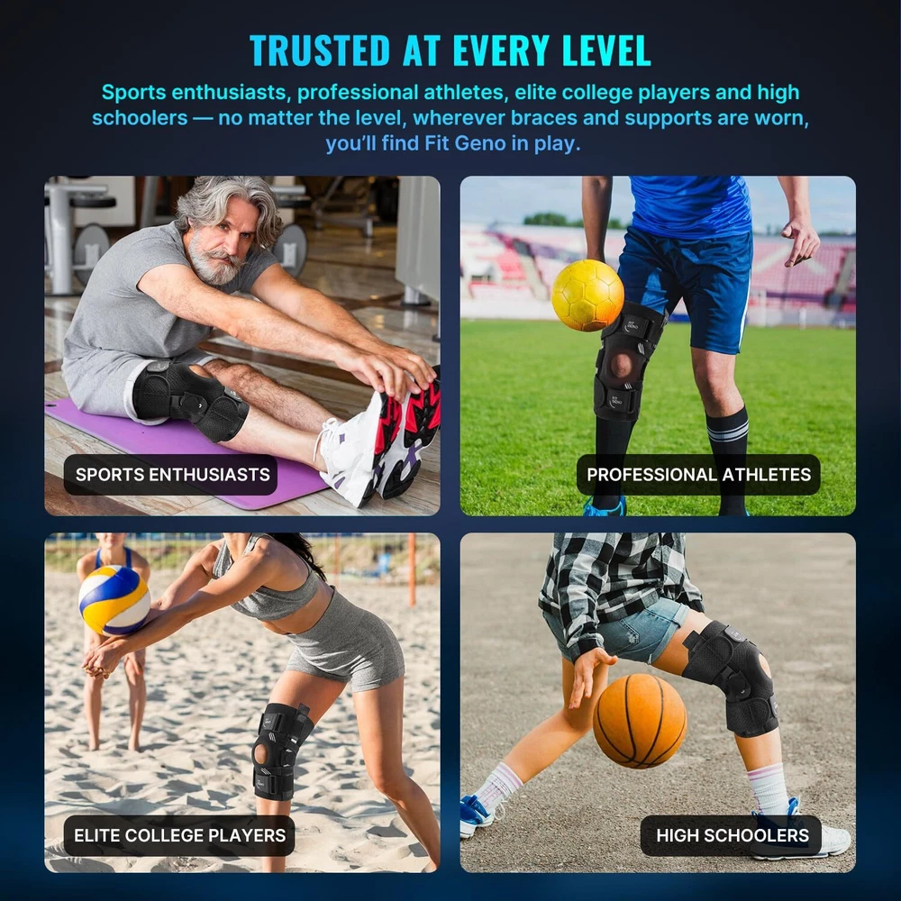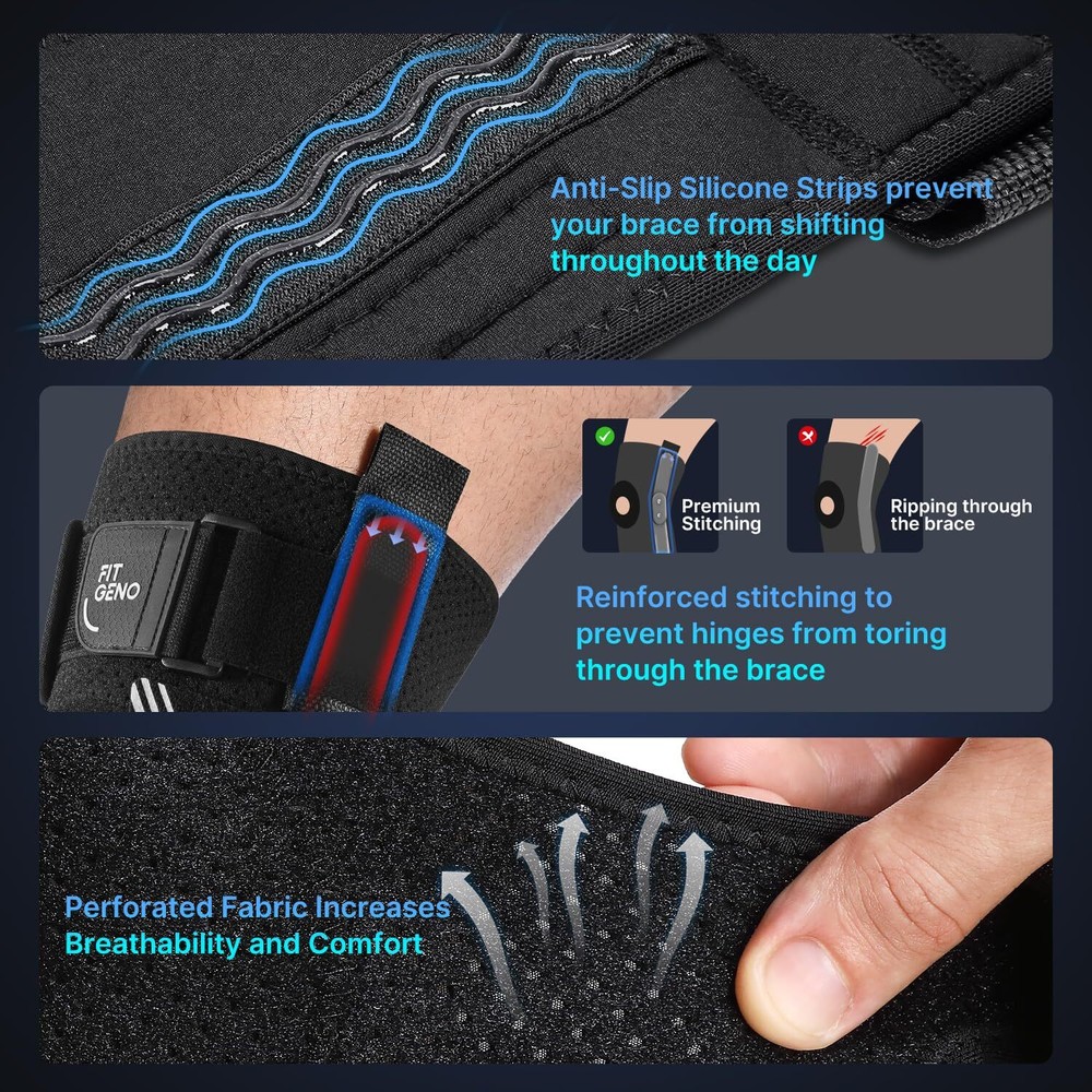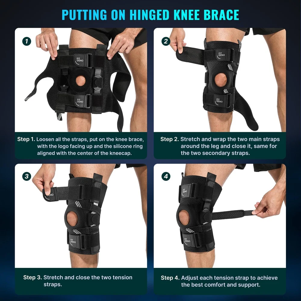 Rodillera con bisagra para desgarro de menisco soporte de rodilla ajustable Product Description About this item MAXIMUM SUPPORT & PAIN RELIEF: Fit Geno’s ReActive+ hinged knee brace with side stabilizers is highly recommended ACL knee braces for men and women to relieve any kind of knee pain. The hinges plus side stabilizers offer maximum support to improve (medial and lateral) stability and helps recover from meniscus tear, runner's knee, sprains, athletic compression, sport-related injuries, mild osteoarthritis, PCL/MCL/LCL and other related ligament problems. SPORTS MEDICINE SPECIALISTS RECOMMENDED: Our hinged knee brace will effectively maintain your joint stability. This adjustable knee brace fits your leg perfectly and protects the knee from potential injuries without sacrificing the mobility! The dual aluminum hinges can be easily removed from the integrated sleeves while the side stabilizers still provide enough support as needed. More flexible than other knee protectors to provide customized support in any situation!!! HEAVY DUTY, MEDICAL-GRADE, LATEX-FREE MATERIAL: Introduced with advanced aluminum, the hinges and stabilizer are super lightweight while durable. The medical grade Patella Gel Pad which is soft, elastic and shockproof is sewn at the patella to prevent patella injury. The breathable material provides compression and soothing warmth yet provides a better airflow to prevent skin irritation thus making it an ideal method for recovery and pain relief! DOUBLE ANTI-SLIP, OPEN PATELLA & BACK DESIGN: 2 Medical grade non-slip silicone strips and 4 adjustable straps to avoid the knee brace sliding down during fierce exercise. Our excellent MCL knee brace is made with open patella and back with cushion to help lessen the stress/pressure to the knee. It also ensures proper alignment for the kneecap and stabilizes the knee while the open-back is designed to ensure optimum comfort and avoids bunching for all-day relief!