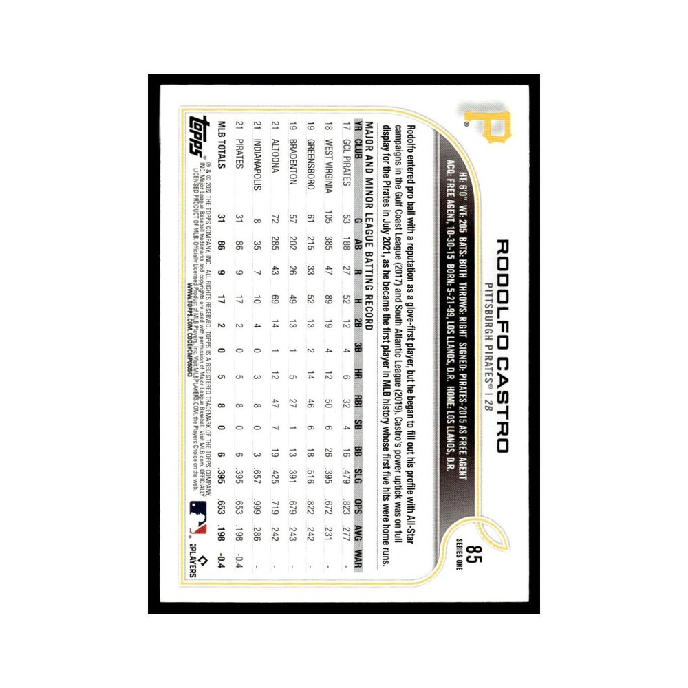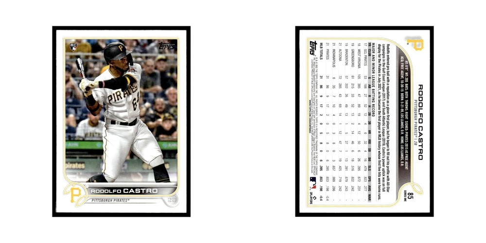Rodolfo Castro Rookie 2022 Topps Opening Day #85 Pittsburgh Pirates Baseball Card NM This card is in near-mint condition or better. Equivalent to a pack fresh card. Learn more about eBay's card condition guidelines here: https://pages.ebay.com/cardconditions/ You will receive the exact card in the scans. Shipping Please note that free standard shipping is sent via eBay standard labels in a plain brown or white envelope. All free standard shipments use penny sleeves and top loaders to protect the cards. There is no tracking using these labels it will say shipped and delivered only. You can view the information by clicking the link in your order. Please be advised that it can take at least two weeks in some cases for the PWE to arrive please do not contact us before then as we will not have any information to give you. If you need it sooner we can provide shipping via any shipping provider for an additional cost. WE BUY COLLECTIONS We are always on the lookout so feel free to contact us.