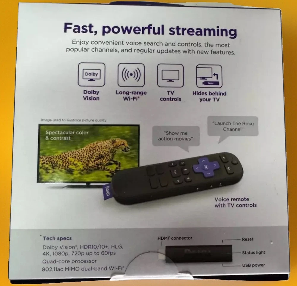 Qty. 1 Roku Streaming Stick 4k Features: Hides behind your TV: The stick design plugs right into your TV with a simple setup Super-fast startup: Start streaming channels like Disney+, HBO Max, Apple TV+, Netflix, Sling, and Hulu in a snap—just turn on your TV Long-range Wi-Fi: Enjoy fast, seamless TV streaming in any room with a strong Wi-Fi connection, now with up to 2x the speed No more juggling remotes: Power up your TV, adjust the volume, and control your Roku Streaming Stick with the Roku remote Voice search & control: Quickly search, play entertainment, and control your streaming device with the voice remote Breathtaking picture: Stream in 4K, Dolby Vision, and HDR10+ with sharp resolution and vivid color Watch what you love: Upgrade your streaming with a massive selection of free, live, and premium TV, including Roku Originals and 350+ Live TV channels for free on The Roku Channel Works with popular voice assistants: Enjoy easy voice control with Siri, Alexa, and Hey Google