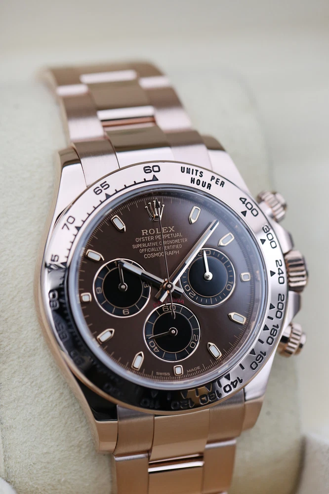 Brand: Rolex Customized: No Case Diameter: 40mm Department: Men Type: Wristwatch Dial: Chocolate Case: Rose Gold Papers: Yes Model: 116505 Reference: DAYTONA Box: Yes
