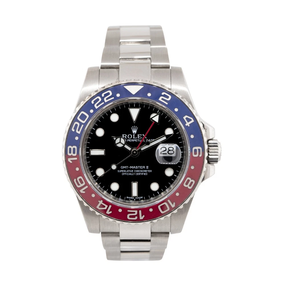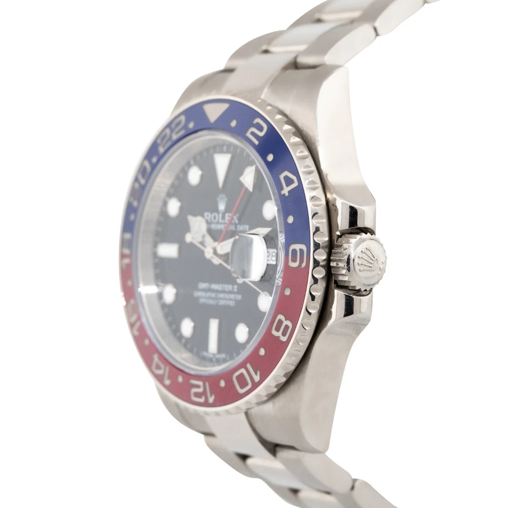 Rolex 116719 GMT Master II 18k White Gold Black Dial Red and Blue Bezel Watch Brand Rolex Model GMT Master II MPN 116719 Case Measurement 40mm Size 7.5" Case Material 18k White Gold Bezel Blue and Red Bidirectional Rotating Ceramic Bezel with GMT Markers Dial Black Dial with White Luminescent Hour Markers and Mercedes hands. Date window is shown at 3 o'clock. Minute markers around the outer rim Bracelet 18k White Gold Oyster Bracelet Clasp Locking Fold Over Clasp Movement Automatic Serial Scram Additional Details This watch comes with a presentation box and 1 year warranty! SKU W4127 Thank you, R aymond Lee Jewelers Return Policy : - Returns accepted within 30 days if item is not as represented or customer is unhappy; buyer has to pay for return shipping costs and insurance. Item must be returned in same condition as received. Florida buyers must pay a 7% sales tax