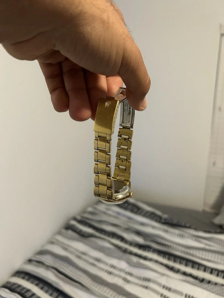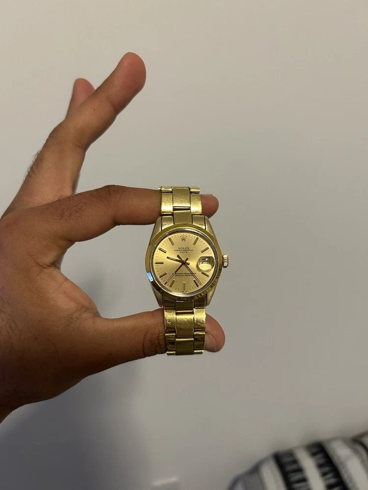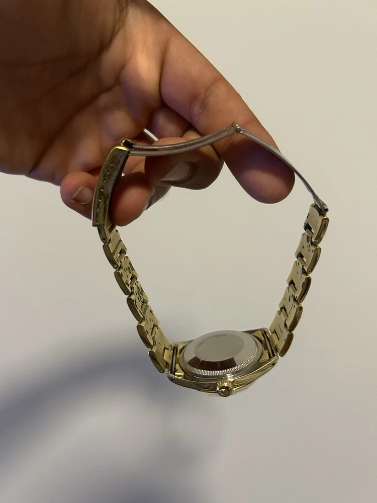 Rolex Date 18k Gold plated with Gold shell case stainless steel 34mm has signs of wear inside bracelet comes with certification of authenticity and watch box. Will be delivered with FREE shipping. Happy bidding and God Bless!